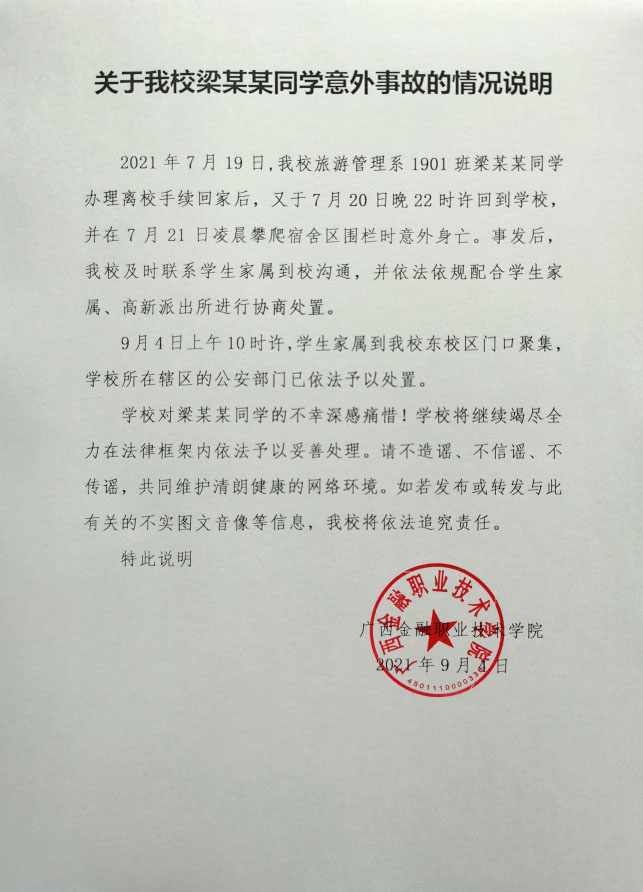 关于kaiyun官网梁某某同学意外事故的情况说明