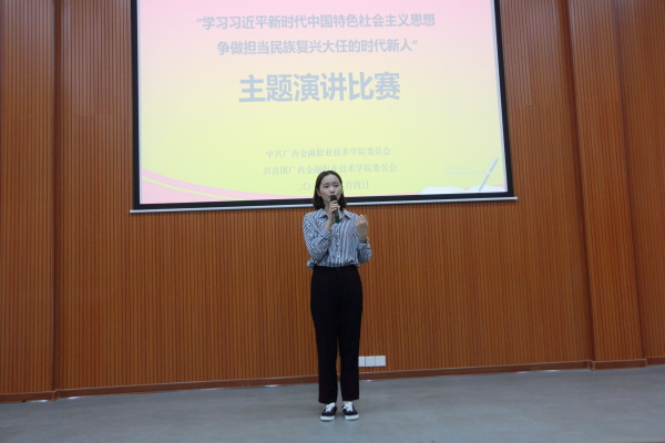 经自主报名,各系部推荐,共选出12名选手参加此次比赛。比赛中,各选手结合自身学习和生活体会,以饱满的精神和声情并茂的演讲,向观众诠释了自己学习习近平新时代中国特色社会主义思想的心得体会,抒发了对祖国的炽热情怀,表达了立志报国的决心。他们的演讲时而激昂高亢、时而低沉颂吟,引起了在场观众的强烈共鸣。精彩的演讲博得阵阵掌声。