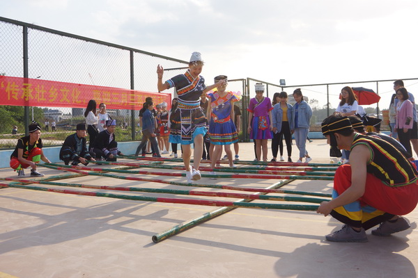 “唱山歌啦,山歌好比春江水,这边唱来那边和……” 投资保险系承办的山歌对唱活动在“刘三姐”、“阿牛哥”嘹亮悦耳的《山歌好比春江水》对唱中拉开了活动序幕。会计系承办的竹竿舞吸引了大量学生参与,同学们随着击杆者 “左左右右”的口令有节奏的舞动和跳跃起来,轻松跨过每一根竹竿。