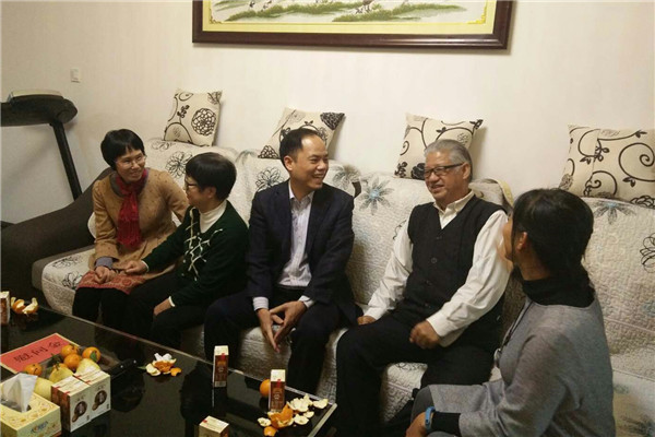 沈书记一行来到校级老领导杨柱才家中,向杨校长介绍了学院2017年的发展情况和取得的成绩,杨校长听了之后感到很欣慰。交谈期间,杨校长向沈书记一行介绍了他退休后的生活状况,同时对院领导的关怀非常感谢,祝愿学院在新一届领导班子的正确带领下越办越好。