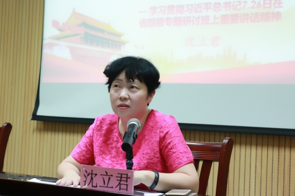与会人员首先观看了新闻联播关于习近平总书记“7•26”重要讲话的新闻报道视频,随后沈书记、院长对习近平总书记“7•26”重要讲话进行了详细解读。她指出,习近平总书记的重要讲话站在决胜全面实现小康社会,夺取中国特色社会主义伟大胜利的战略高度,提出了一系列新的重要思想、重要观点、重大判断、重大举措,科学分析了当前世情国情党情,深刻阐述了5年来党和国家事业发生的历史性变革,深刻阐述了新的历史条件下坚持和发展中国特色社会主义的一系列重大理论和实践问题,深刻阐明了未来一个时期党和国家事业发展的大政方针和行动纲领,具有很强的思想性、战略性、前瞻性、指导性,是中国特色社会主义理论体系的进一步丰富和发展,为党的十九大胜利召开奠定了重要的政治、思想和理论基础,具有重大政治意义、理论意义、实践意义。