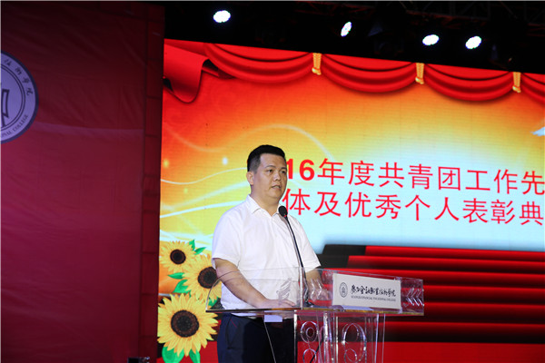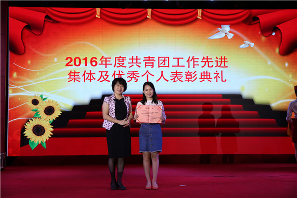 随后,团委书记、学生工作与招生就业处副处长周海峰宣读了《2016年度共青团工作先进集体及优秀个人表彰决定》,院(校)领导一一上台为获奖的集体和个人颁奖。颁奖仪式结束后,进行新团员入团宣誓仪式及全体团员重温入团誓词仪式。全体团员在鲜艳夺目的中国共产主义青年团团旗面前,庄严宣誓,表达对共青团的无限向往和为团组织贡献力量的坚定信心。接下来,覃艳娟书记和沈立君院长一同为学院团委的卡通形象揭幕,青春阳光、活力十足的金小团正式与师生们见面。