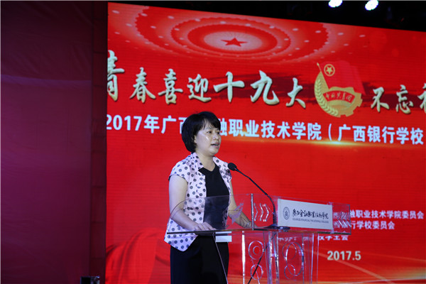 覃艳娟书记为晚会致辞。她向受表彰的先进集体和先进个人表示祝贺,并对长期以来致力于共青团工作的团学干部表示感谢。她说,在过去的一年里,学院(校)团委在组织建设、制度建设、学生社会实践和校园文化建设等方面都取得了良好成绩,为学院(校)的发展做出了很大贡献。在新的形式下,共青团工作要继续紧跟时代步伐,不断创新工作模式和工作方法,把共青团工作做得更加出彩。为此,她向全体团学干部提出四点要求:一要树立坚定理想信念,不忘初心跟党走;二要刻苦学习,志存高远;三要吃苦耐劳,乐于奉献;四要抓住机遇,服务区域发展。希望广大团员学生珍惜青春年华,抓住机遇,在学习、奉献、奋斗和创造中领悟青春的美丽、实现人生价值。