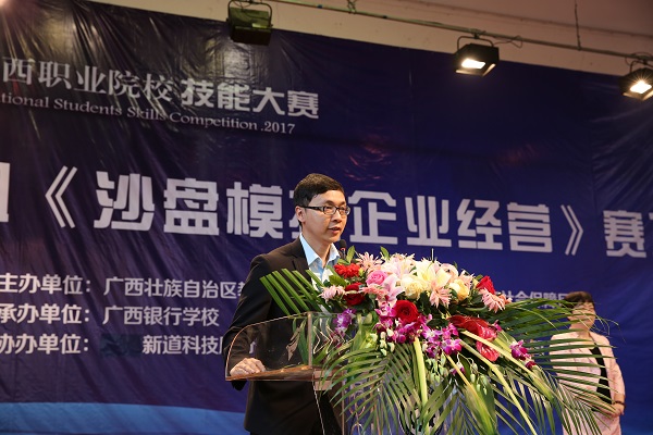 4月20日上午,由自治区教育厅、人社厅共同主办,kaiyun官网承办的2017年广西职业院校技能大赛中职组《沙盘模拟企业经营》比赛在kaiyun官网隆重举行。赛项裁判长范伟,新道科技股份有限公司技术总监黄宇,学校校长沈立君,副校长谢沛善出席了开幕式。开幕式由谢沛善副校长主持。