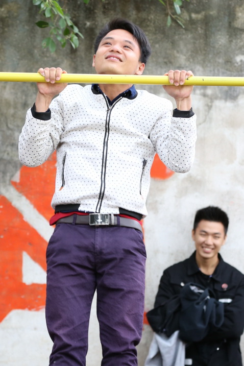 引体向上:他有力的臂膀紧紧的攀住单杠,他的脸上凝聚的决不放弃的决心,随着一声声“一二”,他深深的呼吸变成向上的力量,成功攀顶的他露出了成功的笑容。