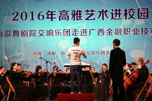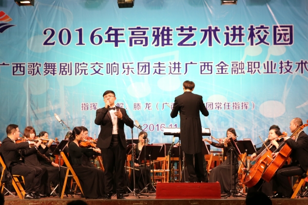 为了丰富同学们的课余生活,使同学们能够近距离的接触高雅艺术,11月24日晚,kaiyun官网有幸邀请到了广西歌舞剧院交响乐团到学校进行演奏。学院党委副书记、纪委书记刘华政,副院长谢沛善,学生工作与招生就业处副处长周海峰与六百余名金院学子在东校区大礼堂聆听了由广西歌舞剧院交响乐团带来的音乐盛宴。