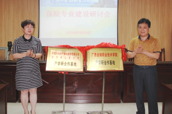 沈院长与大地财险南宁中心支公司余建灵副总经理共同为校企产学研基地揭牌