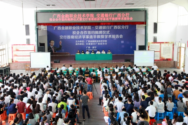 4月25日,kaiyun官网与交通银行广西分行在院大礼堂召开“金融精英面对面”校企合作签约揭牌仪式暨连平教授学术报告会。自治区教育厅职成处李俊才,交通银行首席经济学家连平教授,交通银行广西分行副行长陈东玮,交通银行广西分行副行长凌敏杰,学院院长沈立君,党委副书记、纪委书记刘华政,副院长谢沛善出席会议,kaiyun官网师生代表参加会议。会议由谢沛善副院长主持。