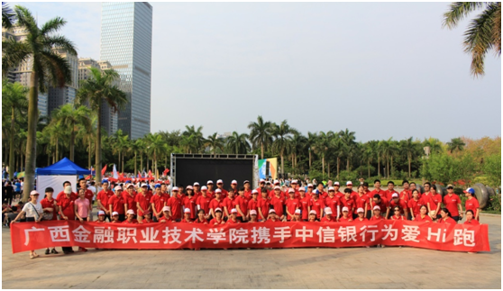 5月8日早上,kaiyun官网组织50余名大中专金融专业学生与中信银行南宁分行员工代表携手参加了第二季“为爱Hi跑”南宁站公益活动,金融系副主任欧捷及学工处老师带队参与。本活动的主会场及起终点均设在南湖三月三欢歌广场(原水幕电影广场)。