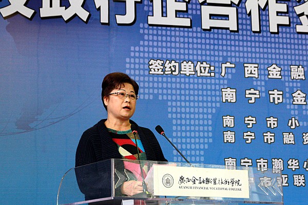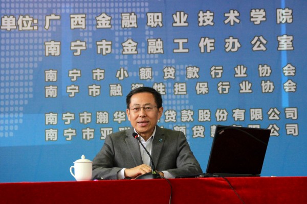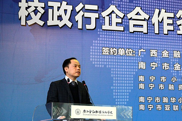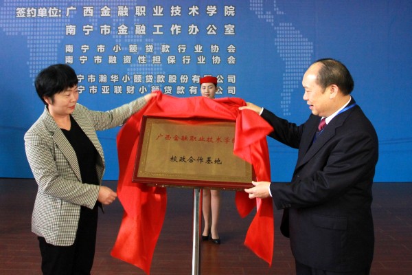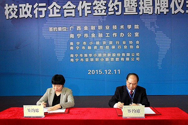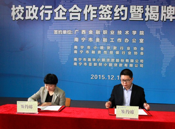 随后,沈立君院长代表学院分别与南宁市金融办、南宁市小额贷款行业协会、南宁市融资性担保行业协会、南宁市瀚华小额贷款有限公司、南宁市亚联财小额贷款有限公司签约并揭牌。中国小额信贷联盟秘书长白澄宇做了题为“互联网时代小贷公司创新与发展”的形势报告。