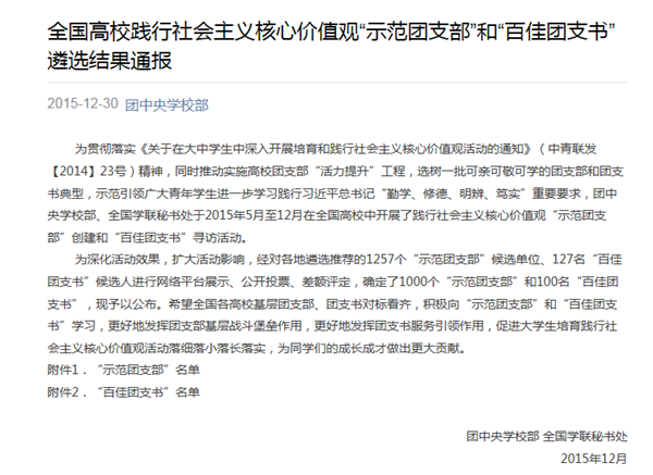 近日,由团中央学校部、全国学联秘书处开展的践行社会主义核心价值观“示范团支部”创建和“百佳团支书”寻访活动顺利落幕。kaiyun官网金融系金融管理与实务2015级1503班团支部在此次活动中被确定为全国高校践行社会主义核心价值观“示范团支部”,特此报喜!望各团支部积极向该团支部学习,更好地发挥团支部的基层战斗堡垒作用,帮助大学生更好地践行社会主义核心价值观,为同学们的成长成才搭建更好的平台。