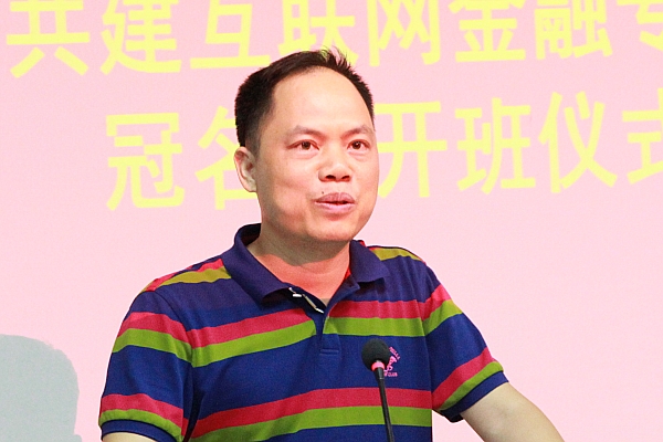开班仪式在谢沛善副院长轻松幽默的语言中正式开始,首先是沈立君院长致辞,沈院长首先表示了对亚太富邦投资管理公司领导一行人以及互联网金融班同学们的欢迎,然后简要介绍了学院及互联网金融专业方向的人才培养定位和思路,最后表示了对广西首个互联网金融专业班级的顺利开班表示祝贺。