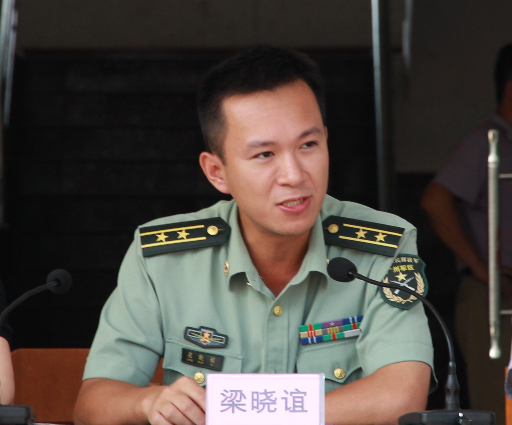 接着,广西军区教导大队梁晓谊中校发表了讲话,他希望全体同学端正态度,服从管理,听从指挥,发扬不怕苦、不怕累的精神,坚定信心,自觉投身到军训中去,以优异的成绩圆满完成军训任务。