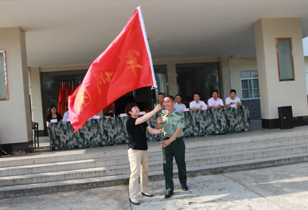 之后,学院领导沈立君同志向军训团团长授军训团团旗,军训团政委潘洪宇向各连连长授军训连连旗。