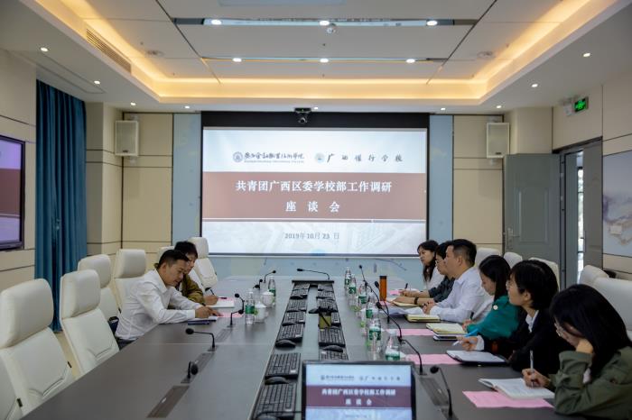10月24日上午,共青团广西区委学校部部长钟声宇、副部长穆辉一行来kaiyun官网调研指导共青团工作并召开调研座谈会。kaiyun官网学生工作与招生就业处副处长、团委书记周海峰、团委副书记朱丽君及校团委老师、团总支负责人代表参加了调研座谈会。