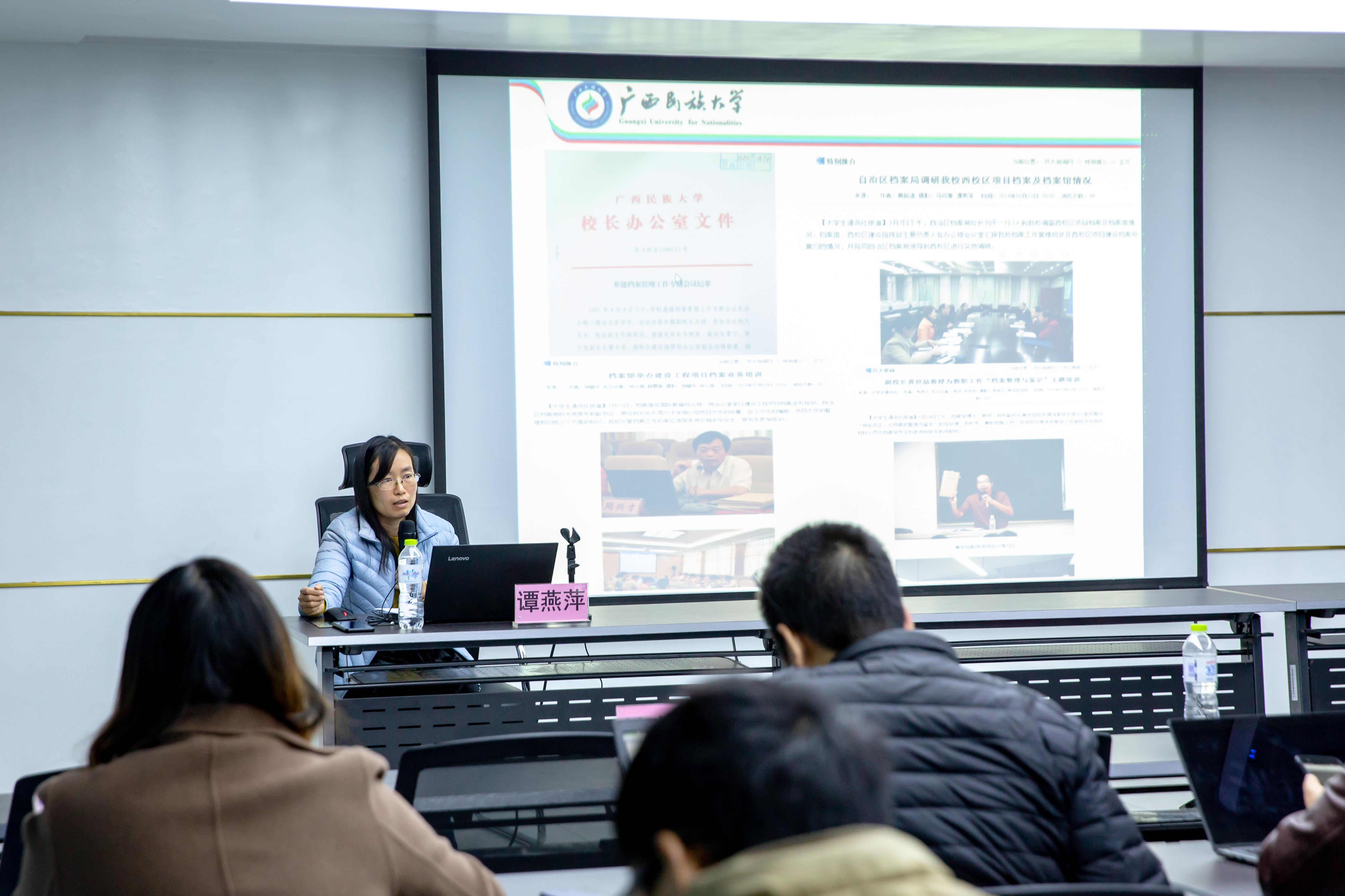 为进一步提升kaiyun官网教职员工对档案管理工作的履职能力,规范kaiyun官网各部门的档案工作,提高档案意识。12月20日下午,广西民族大学档案馆副馆长、研究馆员、硕士生导师,自治区档案局自治区级重大建设项目档案验收专家谭燕萍到kaiyun官网西校区行政楼312会议室举行了“聚焦新时代高校档案工作”的专题讲座。学校副校长潘大胜、党政办公室(国际交流处)副处长韩蓓丽、机要档案科科长陆萍,科级及以上干部、各部门负责人、档案管理员、行政工作人员、各系(部)行政秘书和教学秘书近50人参加了培训。讲座由韩蓓丽主任主持。