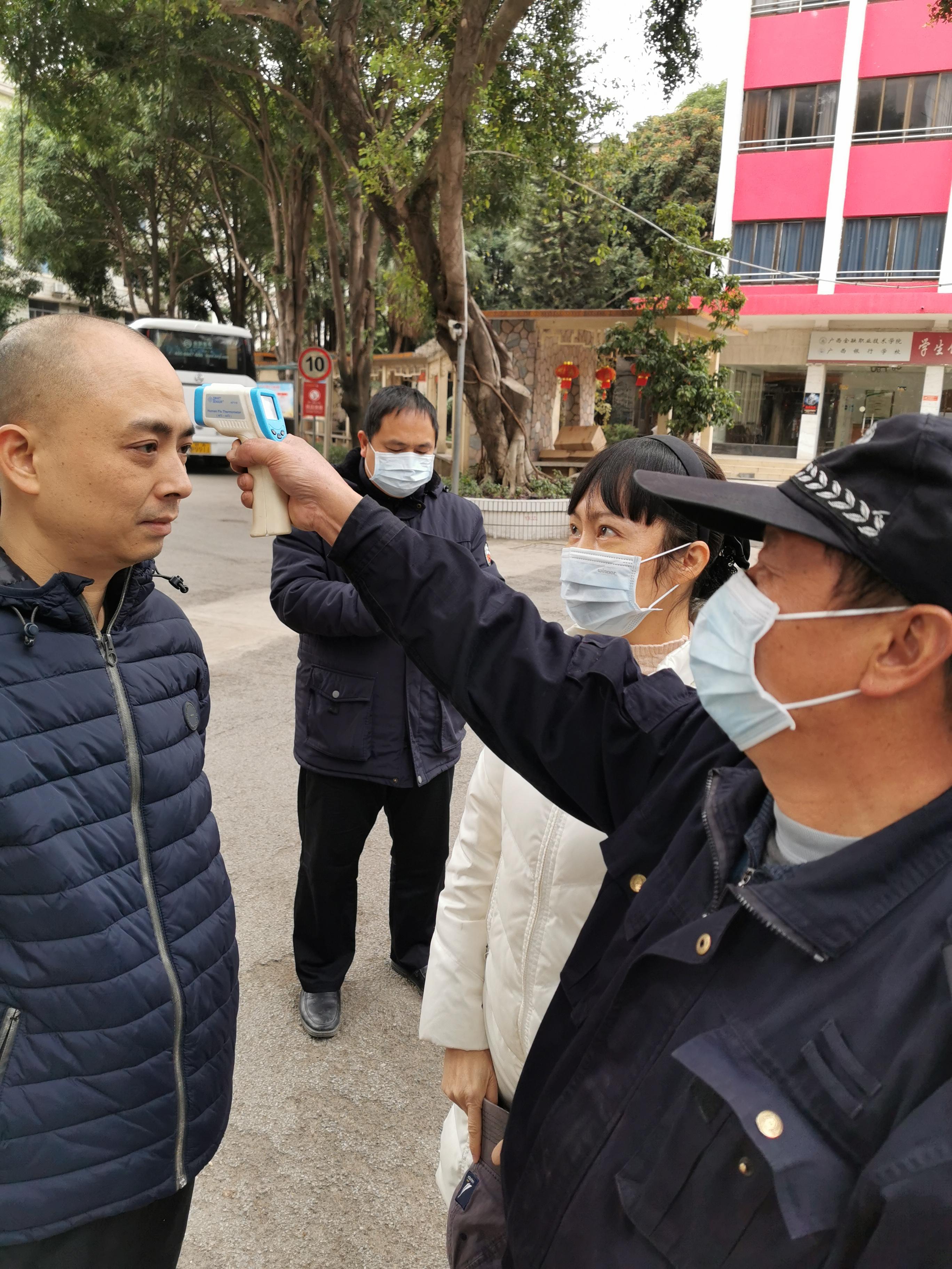 一是全面开展疫情排查。学校要求各单位高度重视,充分认识做好疫情防控工作的紧迫性和责任感,认真开展疫情信息排查工作,严格执行防控信息“日报告”“零报告”制度,确保信息及时、全面、准确。重点掌握湖北籍,尤其是武汉籍以及假期曾到武汉等疫情严重地区及其周边地区师生的相关信息;同时深入细致排查本单位职工和在一起居住生活的家属外出信息及有无接触武汉籍人员历史,每日排查报送从外地返邕的或有发热、咳嗽等症状的教工信息。同时要求从外地返邕的教职工要按照要求自觉开展居家隔离观察,严防疫情发生。二是强化应急值班值守。认真落实假期值班值守工作。总值班室、保卫处、校医室严格执行24小时值班制度,全校各单位值班人员及带班领导按照要求在岗值班,保持通讯畅通,及时处理紧急事务。三是狠抓校园日常管控。疫情发生后,学校暂停举行一切聚集性活动,严格执行大门门禁管理措施和登记制度,做好进出人员的体温检测,严格控制外来人员、社会车辆进入校园。督促物业公司对家属区进行严格管理,后勤管理处开展校园环境卫生整治,加强校园重点部位的全方位清洁消毒工作。