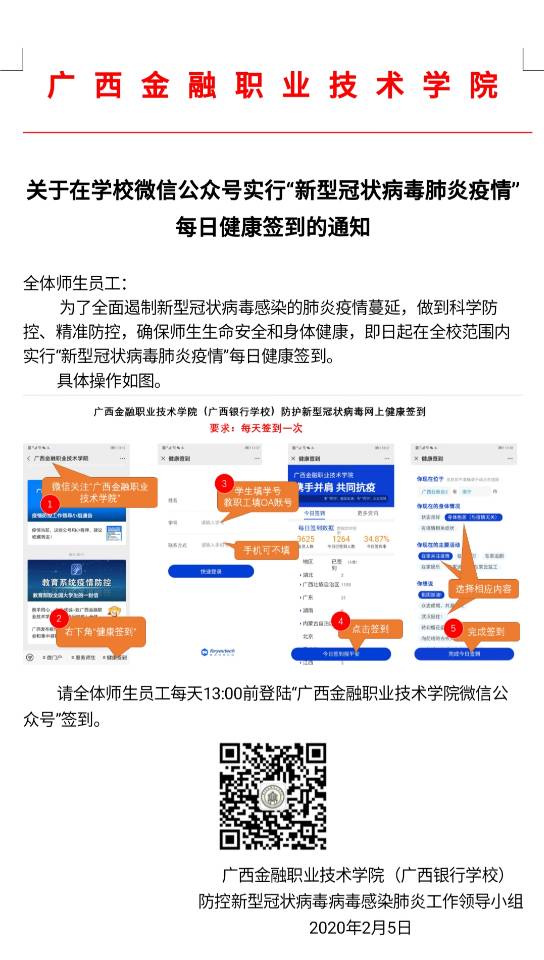 学校微信公众号特别推出了“健康签到”功能,要求涉及的12463名师生每天通过微信快速、准确上报个人健康状况,为及时收集和上报相关信息提供了坚实的保障。