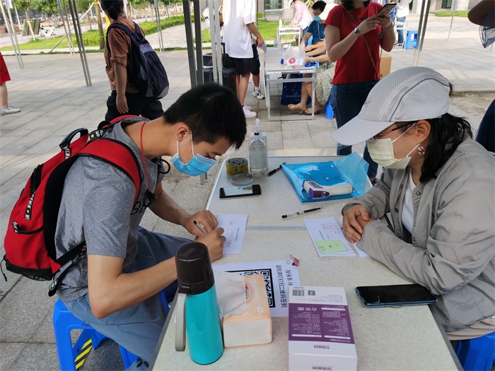 志愿者给返校学生测量体温