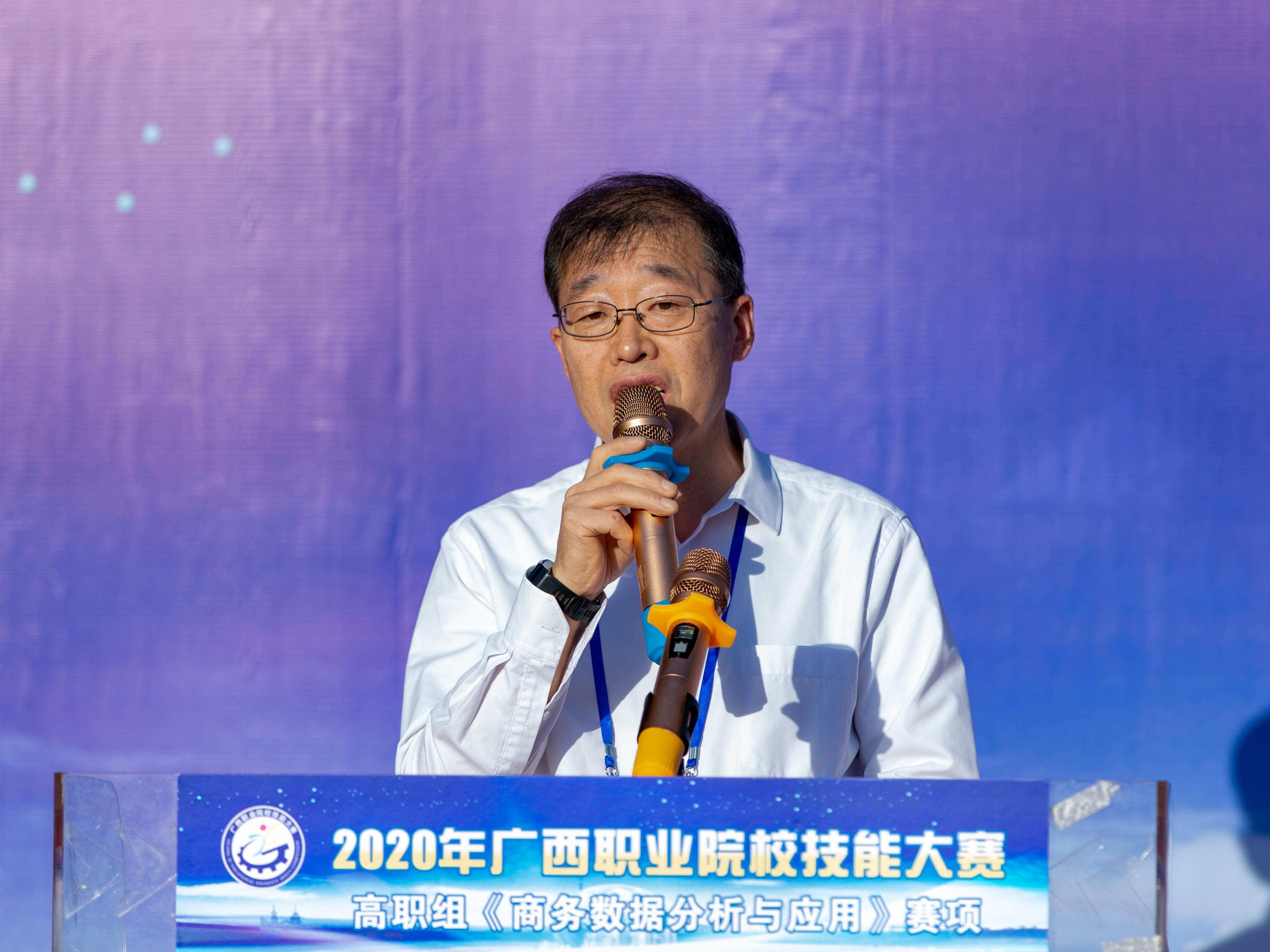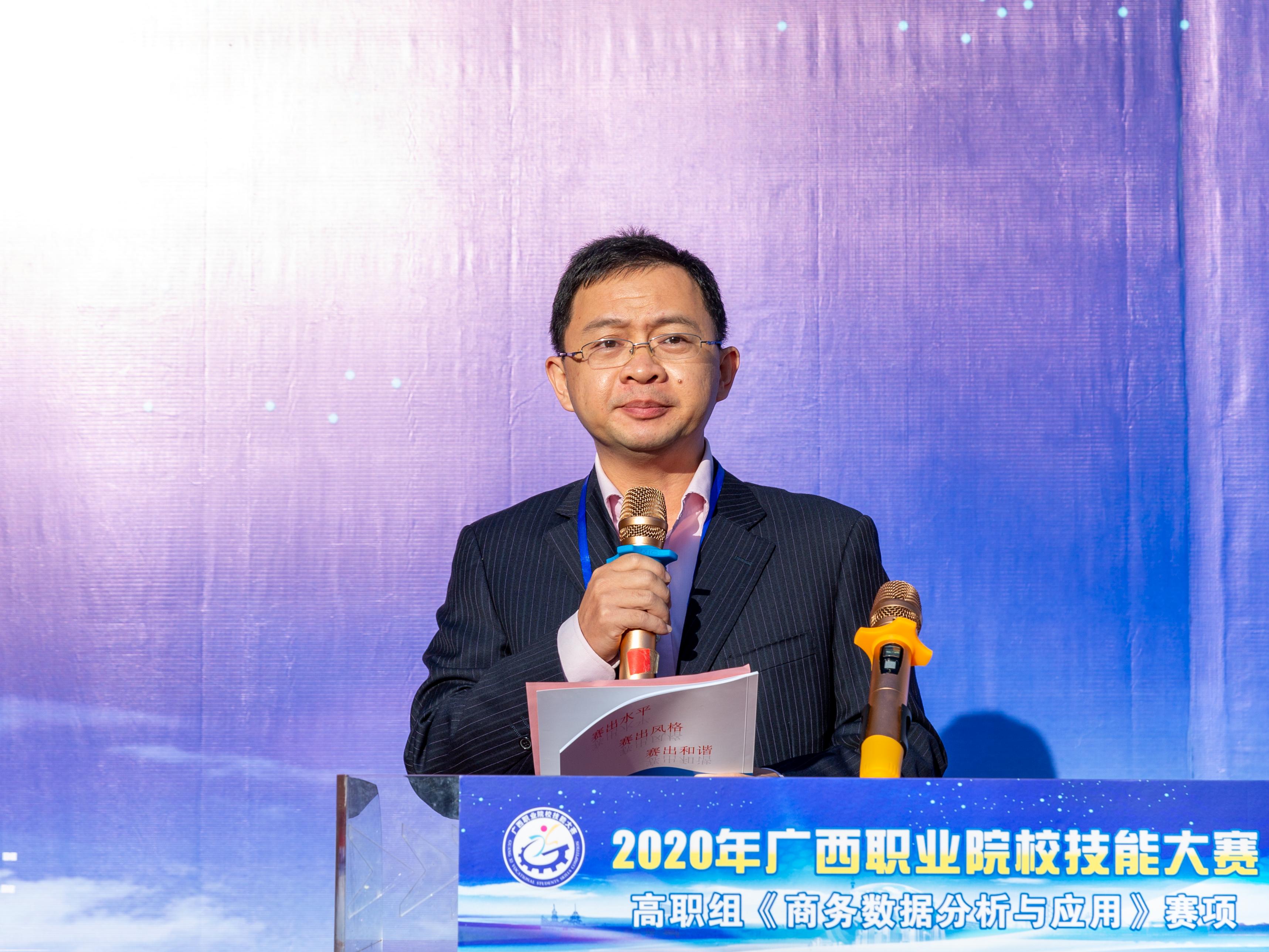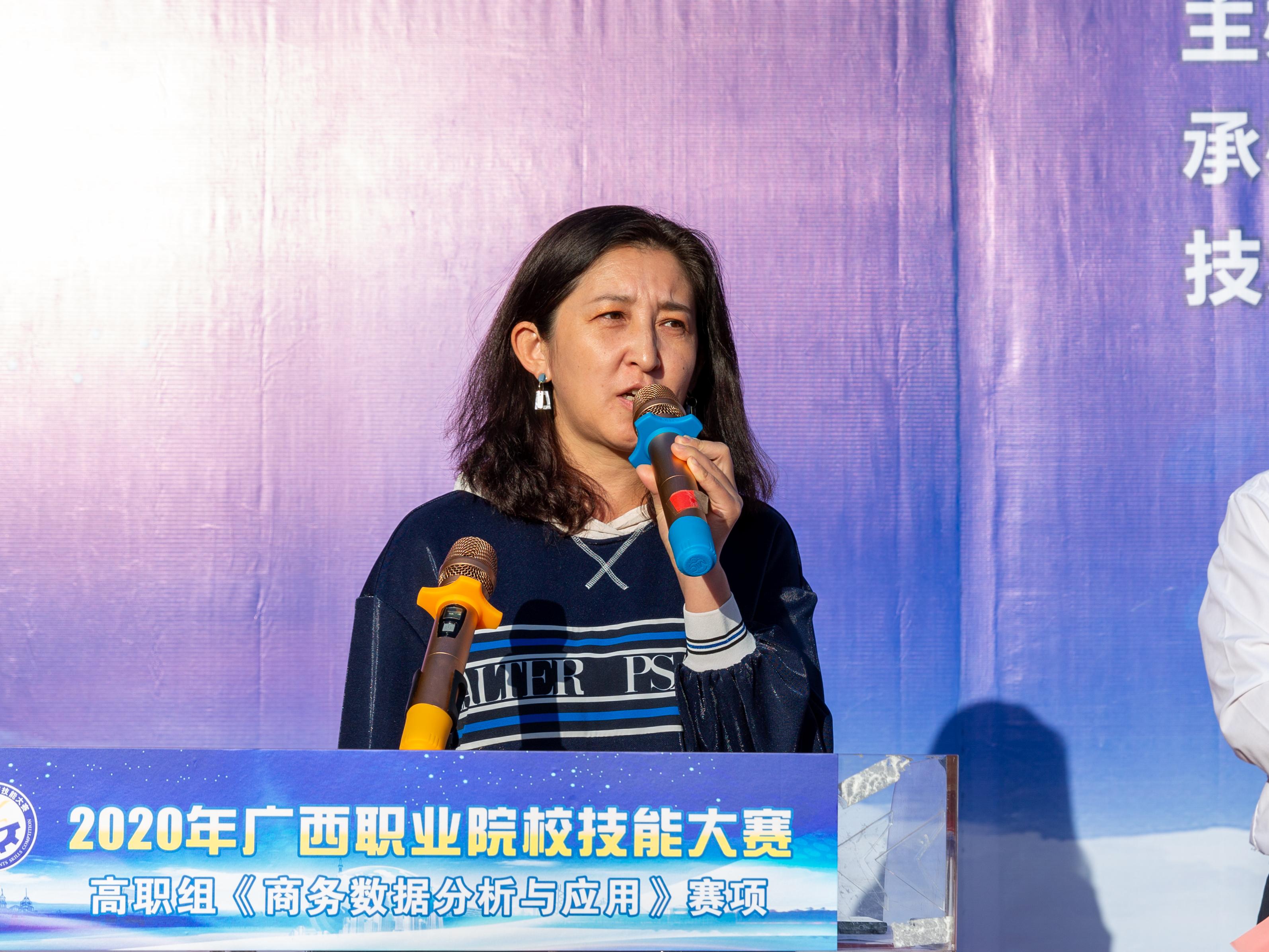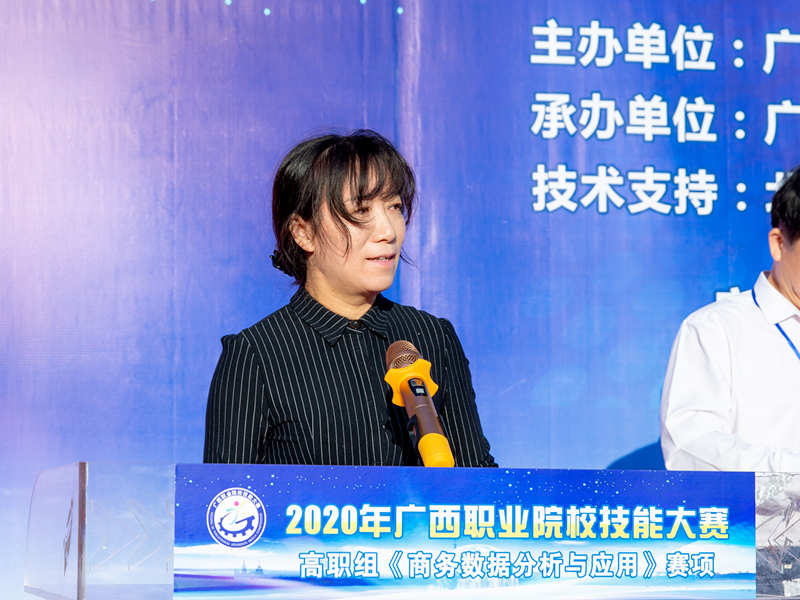 莫海燕院长在开幕式上致辞,她指出,随着电子商务的迅速发展,大数据在商务领域的应用越来越彰显其优势。“商务数据分析与应用”技能已成为电子商务从业人员的核心能力,我区首次将“商务数据分析与应用"列入高职组赛项,不仅是为国赛储备选手,也是为我区职业院校电子商务专业师生切磋技艺和交流经验提供平台,引领学生磨炼技能、锤炼本领,践行大国“工匠精神”,更重要的是适应广西数字经济产业发展需求,促进我区商务大数据高技能人才的成长成才,为建设壮美广西、共圆复兴梦想贡献力量。同时希望工作人员和裁判员严格遵守竞赛规则,坚持公平、公正、公开的原则,认真负责,一丝不苟,坚守岗位,公正裁判,确保大赛顺利进行。