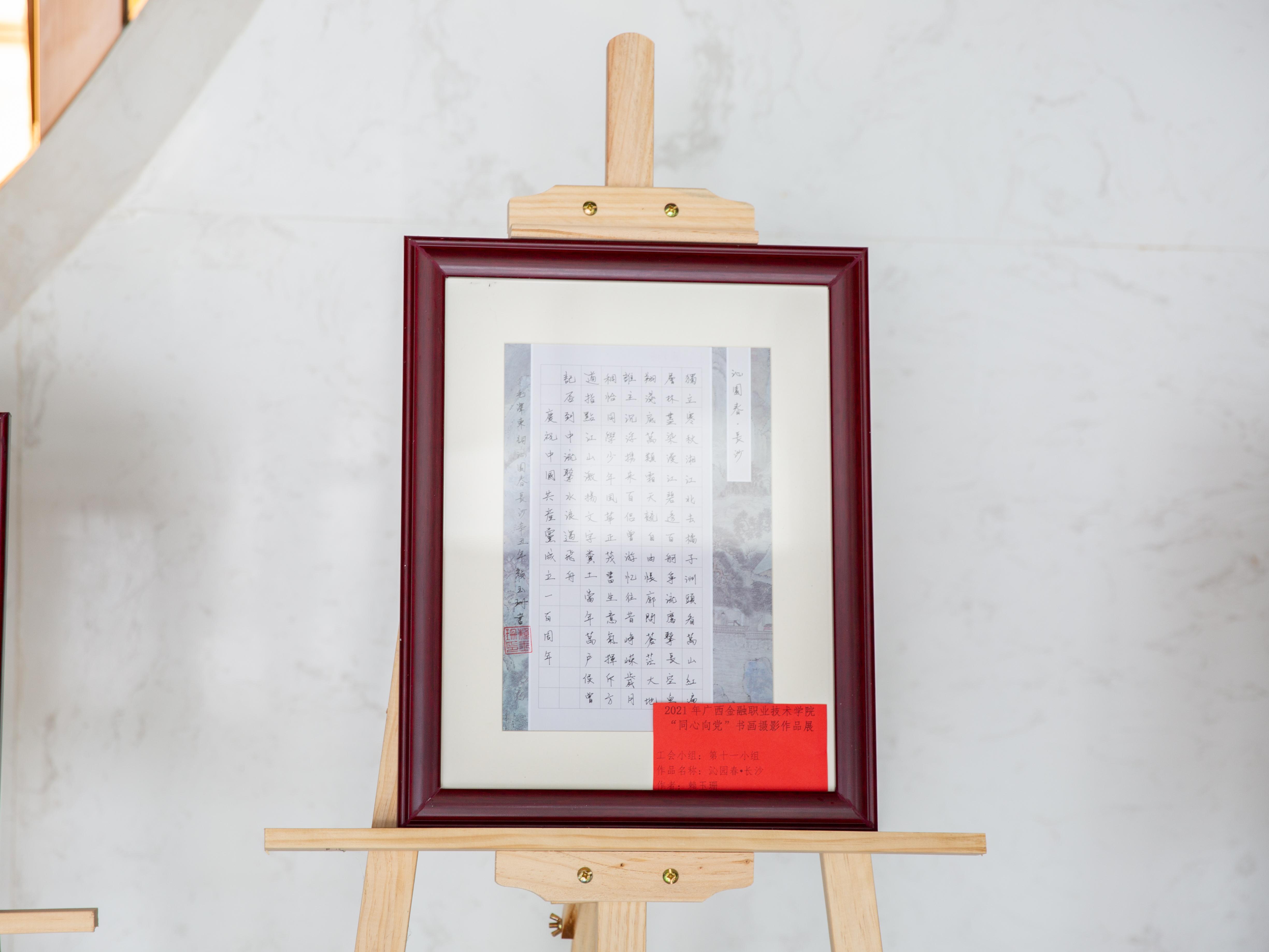 本次展览共展出21幅书法、绘画和摄影作品。评选出一等奖1名、二等奖3名,三等奖6名,优秀奖11名。其中王建国老师的书法作品《习近平在党史学习教育动员会上的讲话》、《求客观、务执政对联》分获一等奖、二等奖,禹志远老师的绘画作品《壮乡新貌》、孟菁璐老师的绘画作品《走进新时代》获得二等奖。