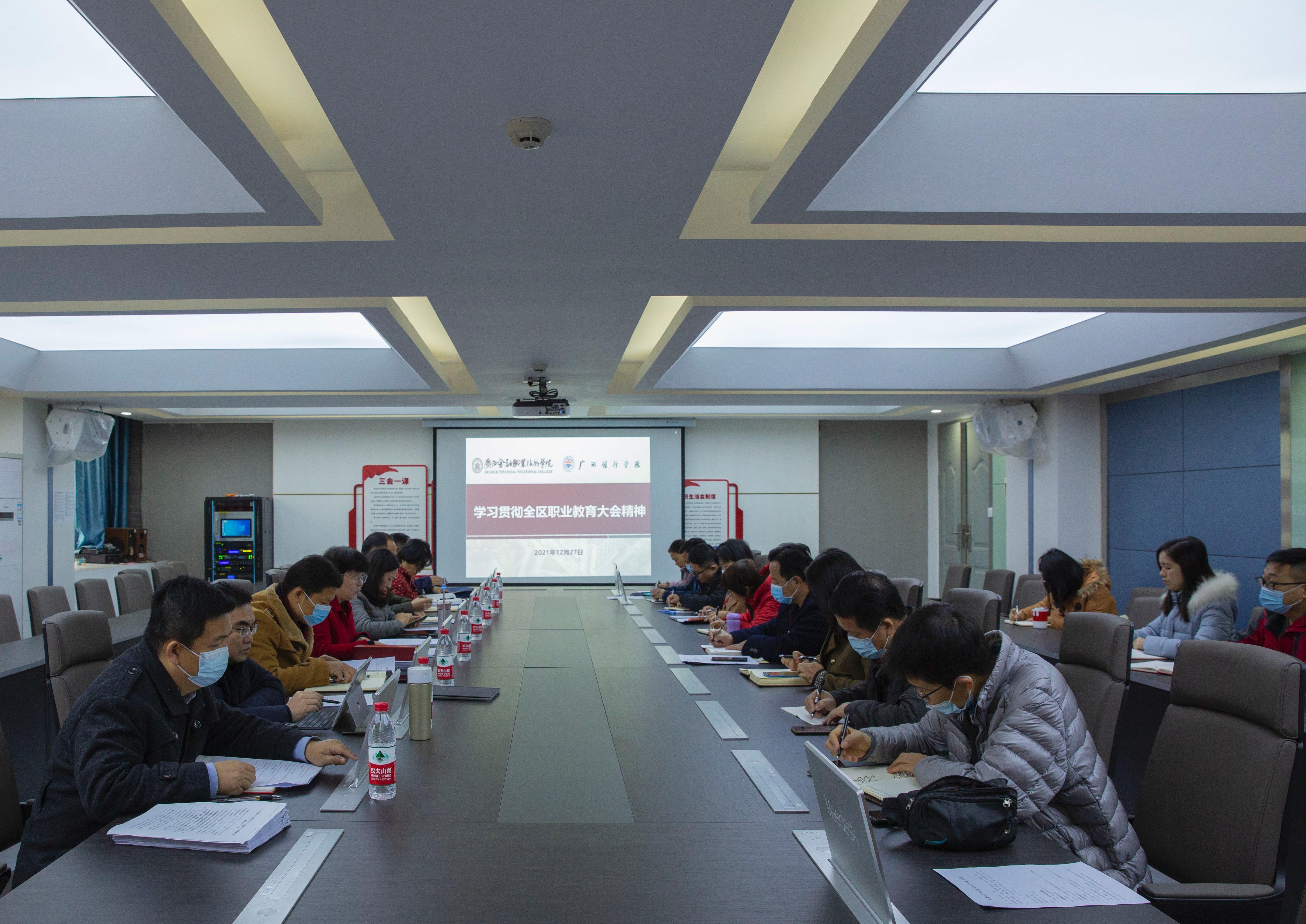 会议要求,一是提高政治站位,统一思想认识。要充分认识全国、全区职业教育大会的重要意义,切实把思想认识和行动统一落实到大会的各项部署上来。二是迅速组织传达,掀起学习热潮。结合学校实际,研究找准贯彻落实的着力点和突破口,实现学习传达全覆盖,确保把大会精神传达到每一名党员、每一位师生。三是加强党的领导,坚定社会主义办学方向。要切实加强学校党的领导和党的建设,保证党的教育方针政策在kaiyun官网得到不折不扣的贯彻执行。四是精准把握政策,推动学校高质量发展。深入贯彻《国家职业教育改革实施方案》《关于推动现代职业教育高质量发展的意见》《深化新时代教育评价改革总体方案》和《广西壮族自治区国民经济和社会发展第十四个五年规划和2035年远景目标纲要》等文件精神和要求,进一步深化教育教学改革,创新办学体制机制,加强内部管理,激发办学活力。全面提高学校人才培养、学科建设、科学研究、社会服务、文化创新的能力和水平,为建设新时代中国特色社会主义壮美广西提供强有力的人才支持和智力保障。