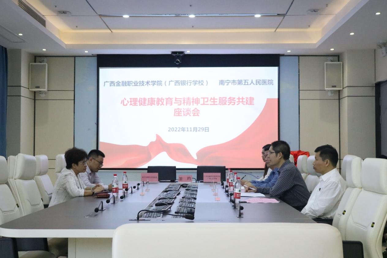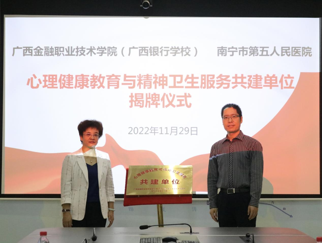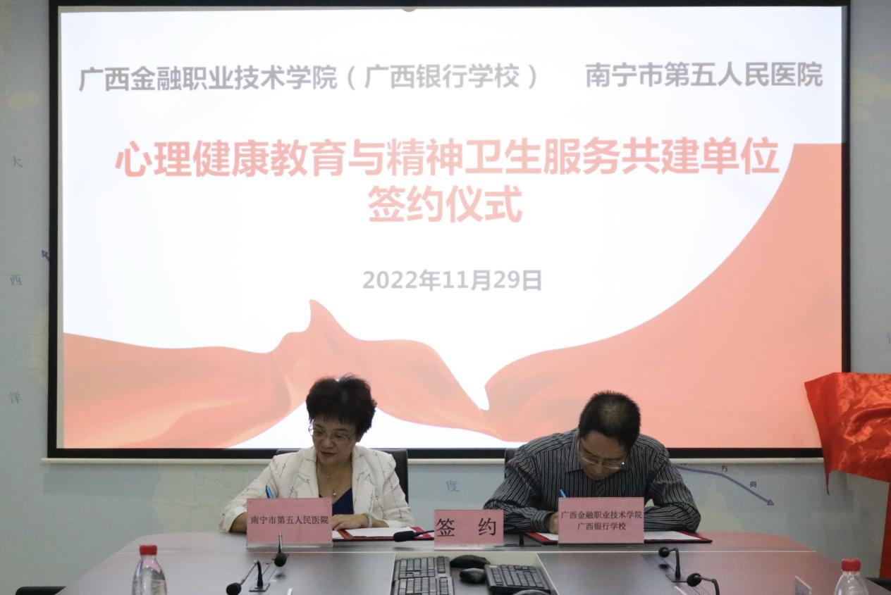 2022年11月29日,kaiyun官网与南宁市第五人民医院的心理健康教育与精神卫生服务合作共建单位签约揭牌仪式在西校区行政楼103会议室顺利举行。南宁市第五人民医院党委书记张玲、心理健康科科主任蒋春雷参加签约揭牌仪式,kaiyun官网党委书记李高岩、党委副书记、纪委书记刘华政,学生工作与招生就业处处长校周海峰,与心理健康教育专职教师代表、各系教师代表共同出席。