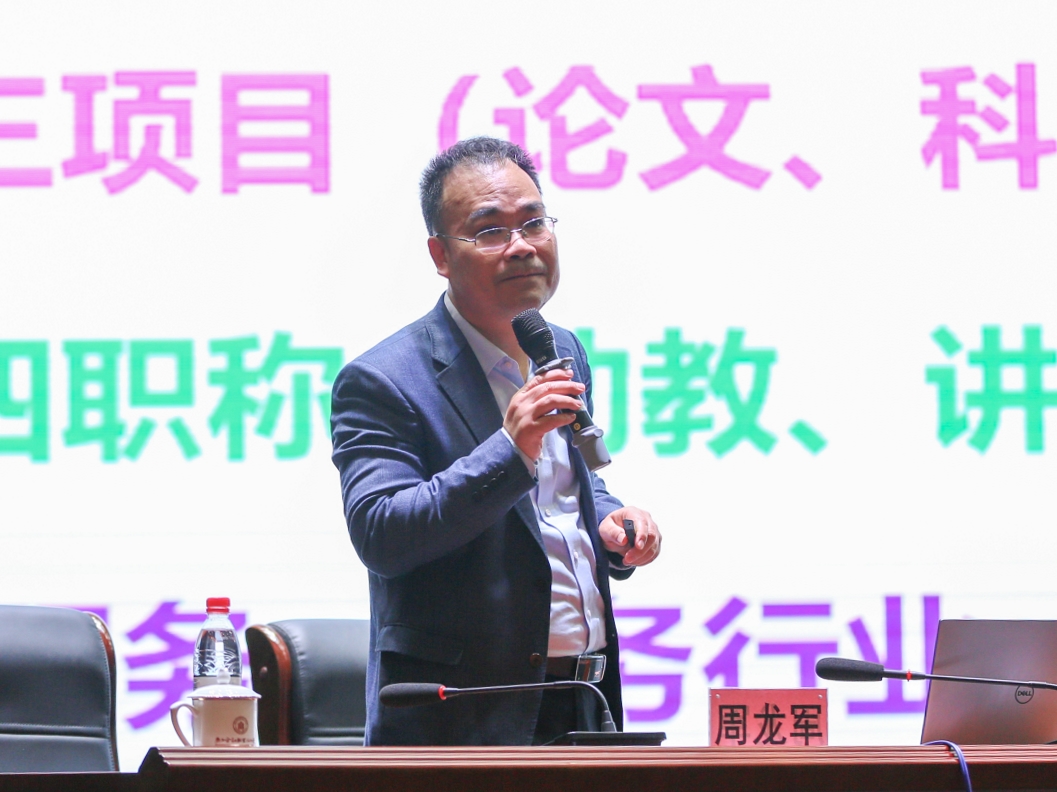 周龙军教授以“梦想起航:高校教师职业生涯进阶发展”为主题,通过“为什么想当一名老师”“想成为怎样一名老师”“怎样成为一名优秀老师”三方面分享了自己从教30多年的成长历程和育人心得,他用发人深省的故事,鲜活生动的案例,深入浅出地为我们诠释了作为一名光荣的人民教师的意义与价值、方向与目标、路径与方法,其幽默的语言令大家如沐春风,乐观的心态深深地感染着在场的每一位教职工。周教授在讲座上指出,做一名老师是快乐幸福而有意义的,要不断提高道德修养,要成为一名优秀的教师必须做“六有”教师、要做科研写论文、要开展校企合作。