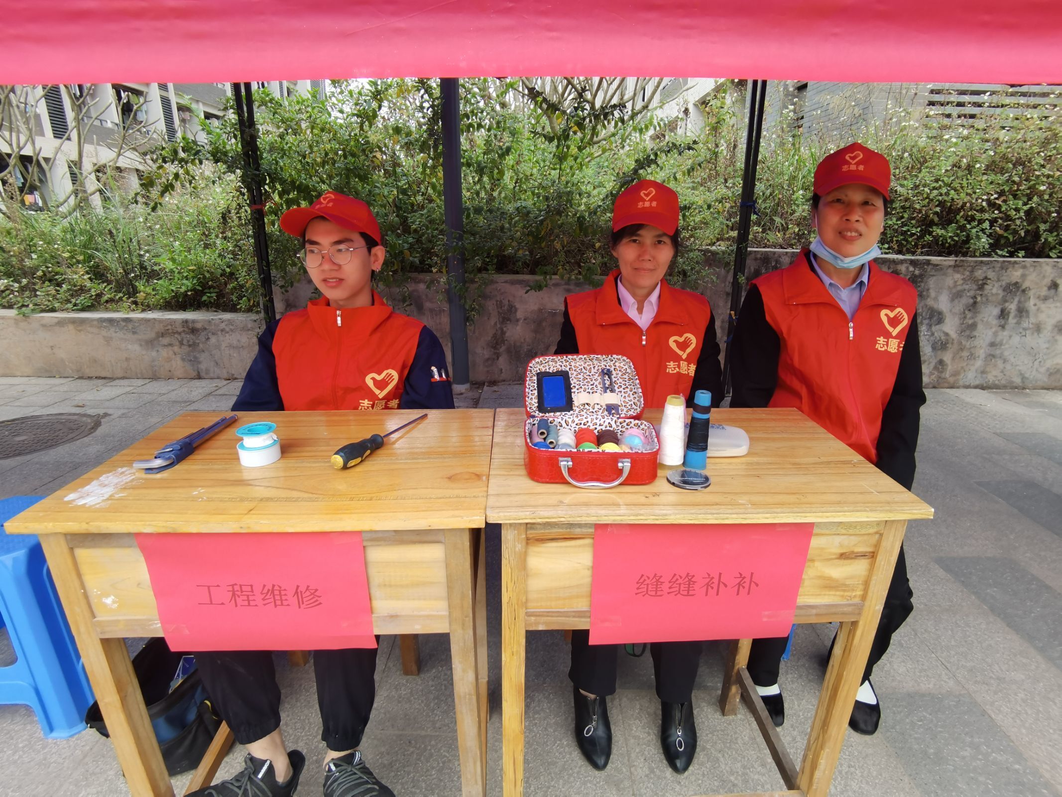 工程维修和针线缝补等学雷锋志愿活动现场