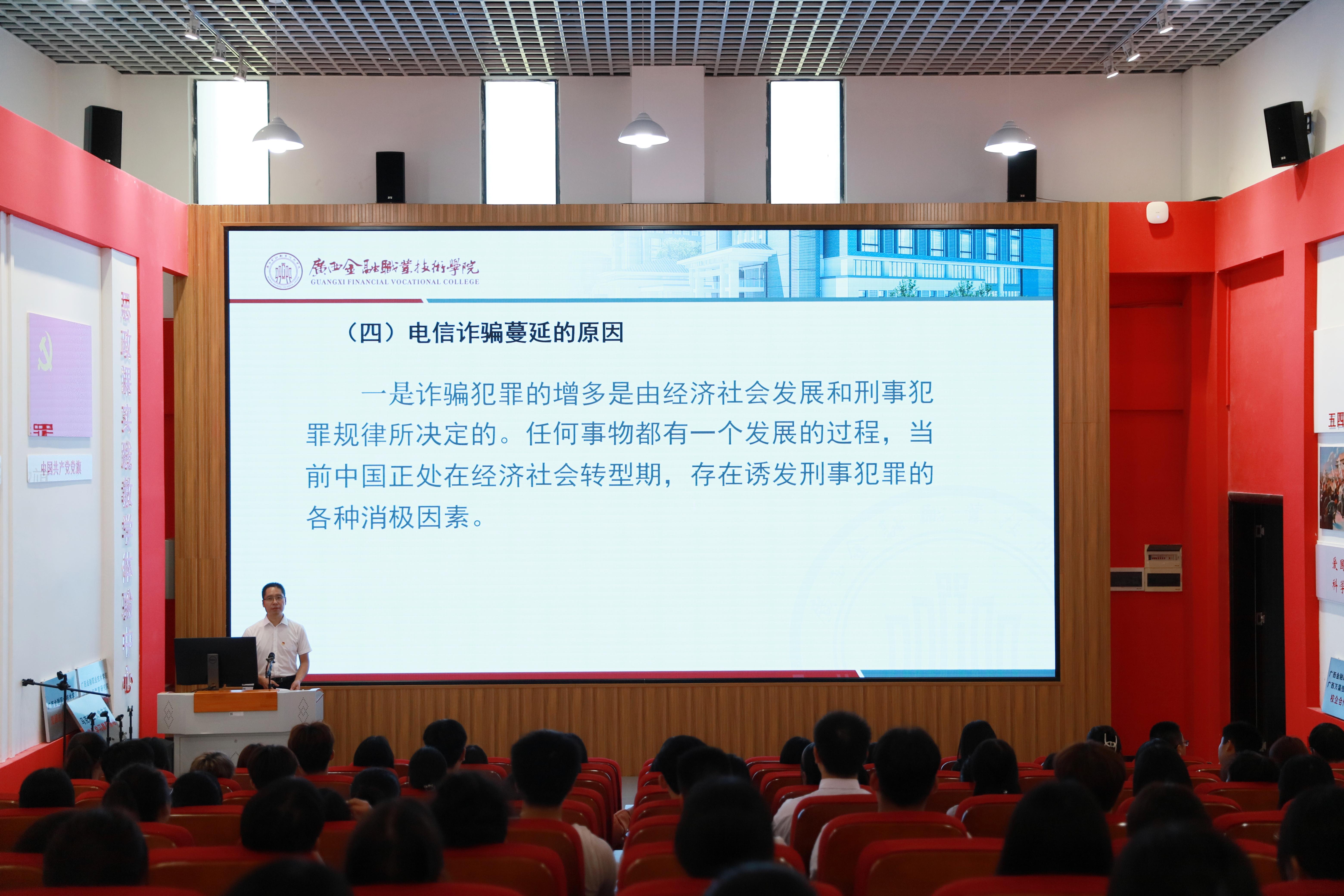 课上,李书记将2023年暑假档的热门电影《孤注一掷》以及被骗至缅甸的中科院博士获救等各种各样的新闻报道为导入,分“什么是电信诈骗”“电信诈骗的常见形式”“如何识别防范电信诈骗”“五招补救措施”四个部分作了精彩授课。在讲授过程中,李书记分析了电信诈骗的含义、特点及其蔓延的原因,呈现了20种电信诈骗的常用骗术和其他常见手法,让同学们意识到电信诈骗、网络诈骗等安全隐患层出不穷。同时,李书记还分析了电信诈骗的共同规律,分享了“5个常见诈骗防范提示”和“防电信诈骗十守则”,帮助同学们提高自我防范意识,也使同学们进一步增强了防范网络电信诈骗的本领。