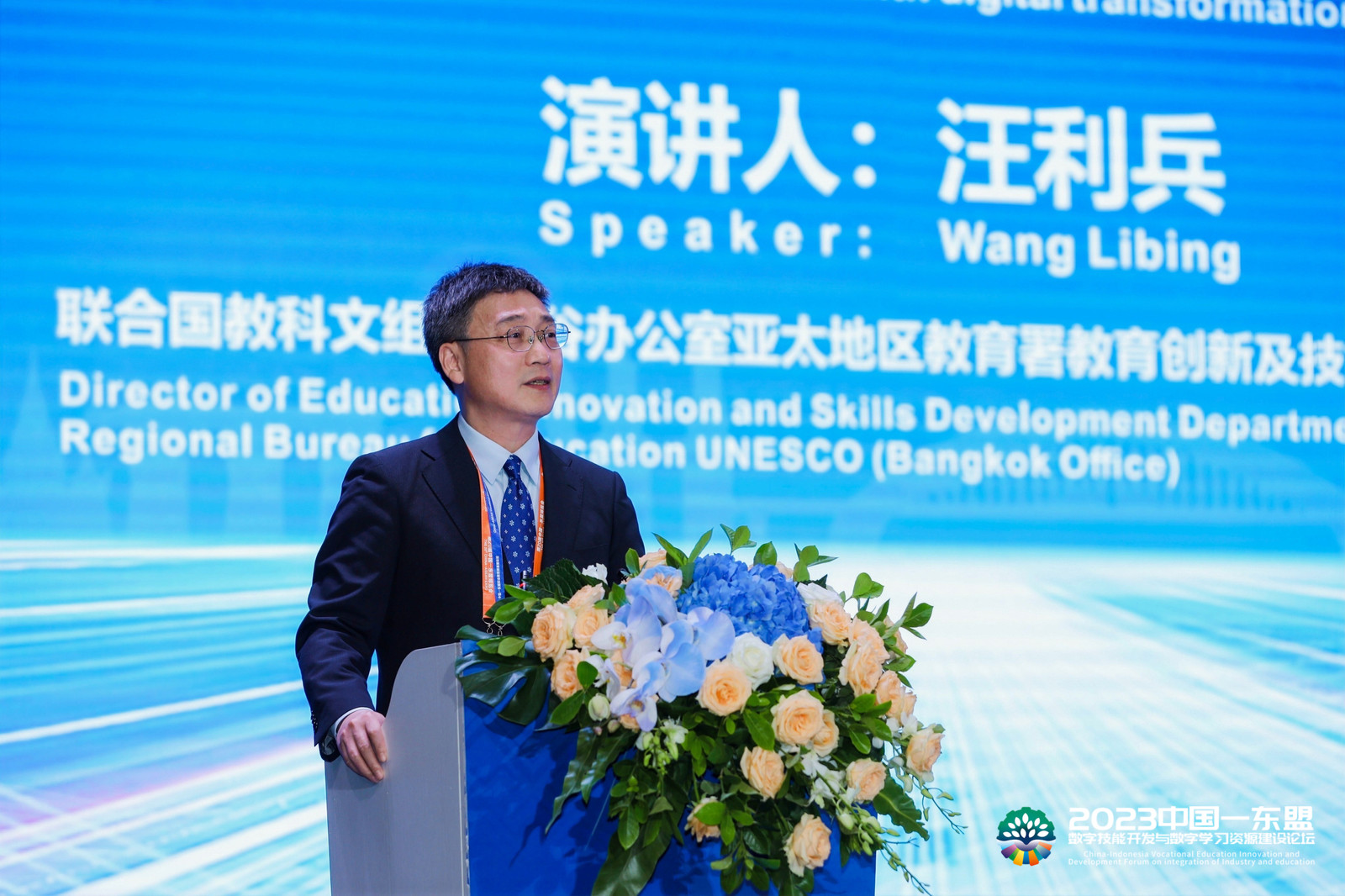联合国教科文组织曼谷办公室亚太地区教育署教育创新及技能发展部主任汪利兵先生发表主旨演讲