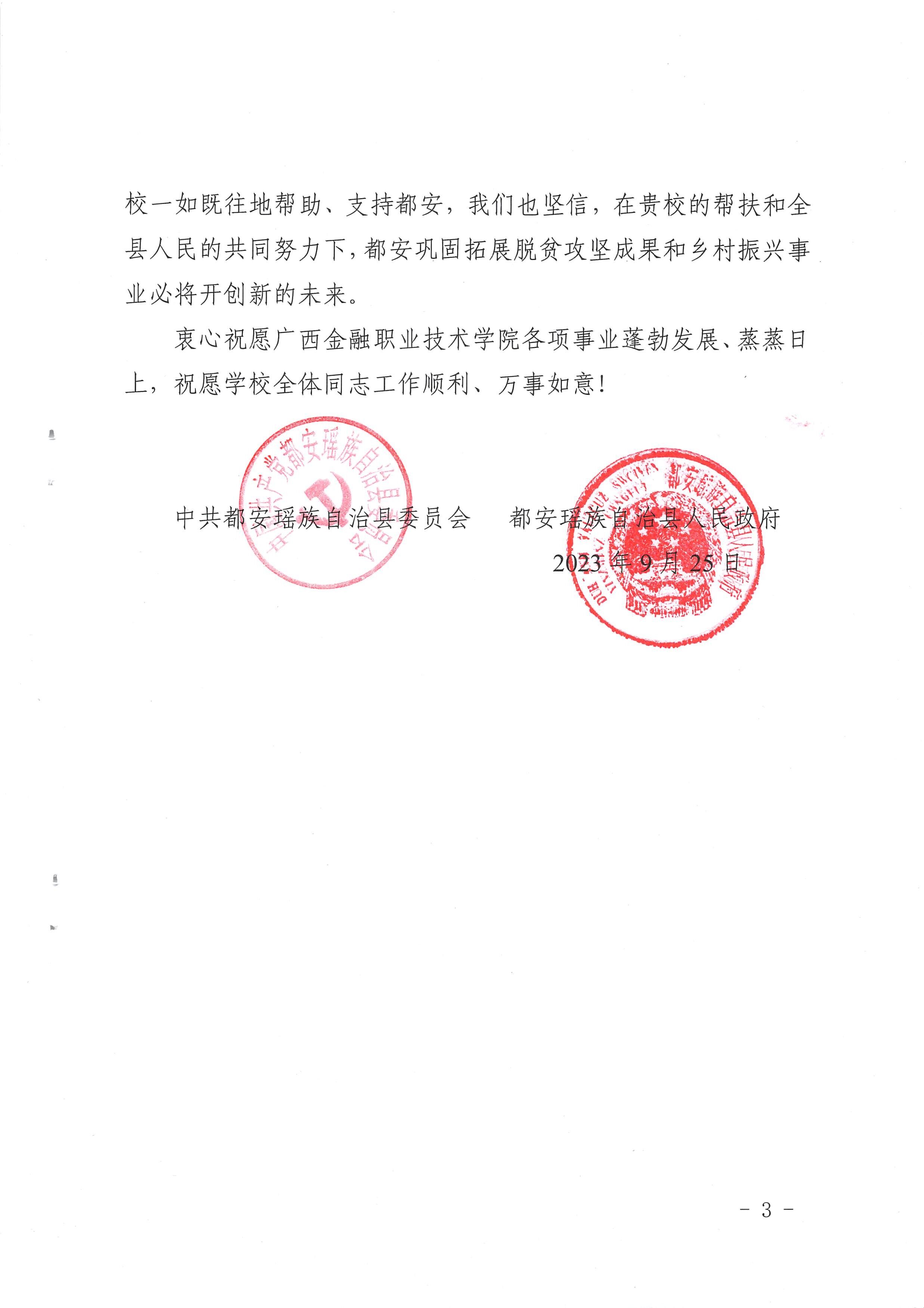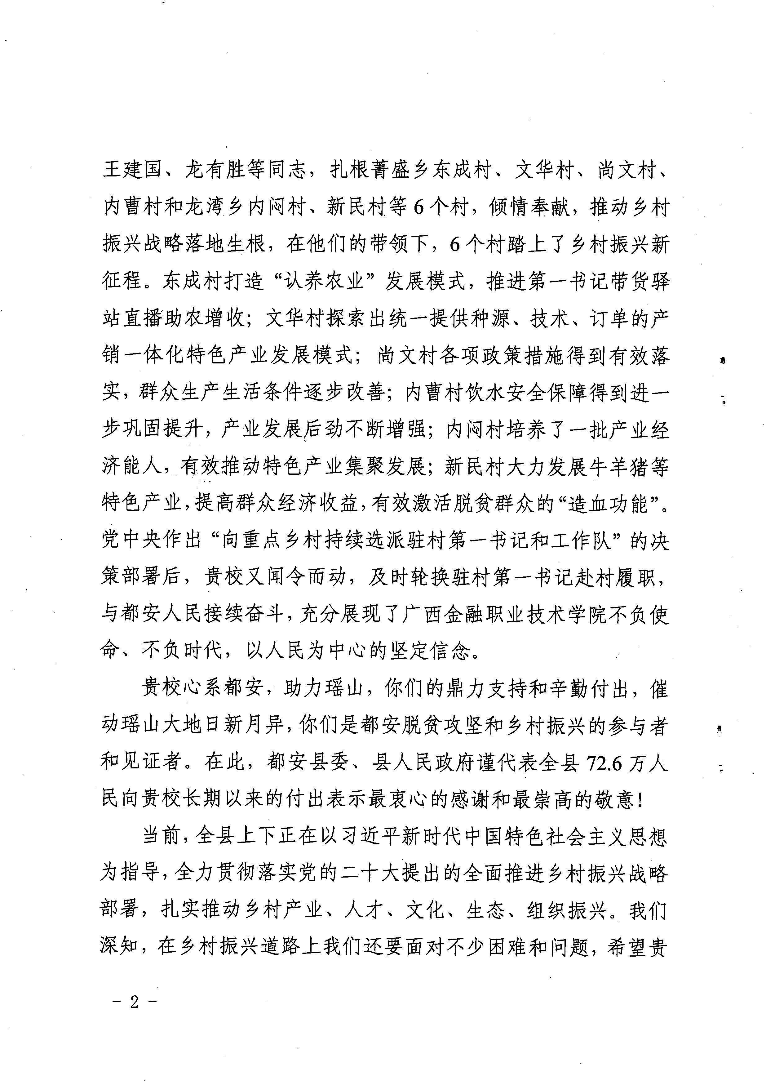 近日,中共都安瑶族自治县委员会向kaiyun官网发来《感谢信》,对kaiyun官网支持、帮扶都安,巩固拓展脱贫攻坚成果同乡村振兴有效衔接做出的突出贡献表示感谢,就kaiyun官网选派的驻村第一书记郑腾飞、唐运杰、杨蓬、韦昕晨、周树国、王建国、龙有胜等同志高标准高质量完成所承担的各项工作任务给予高度评价。
