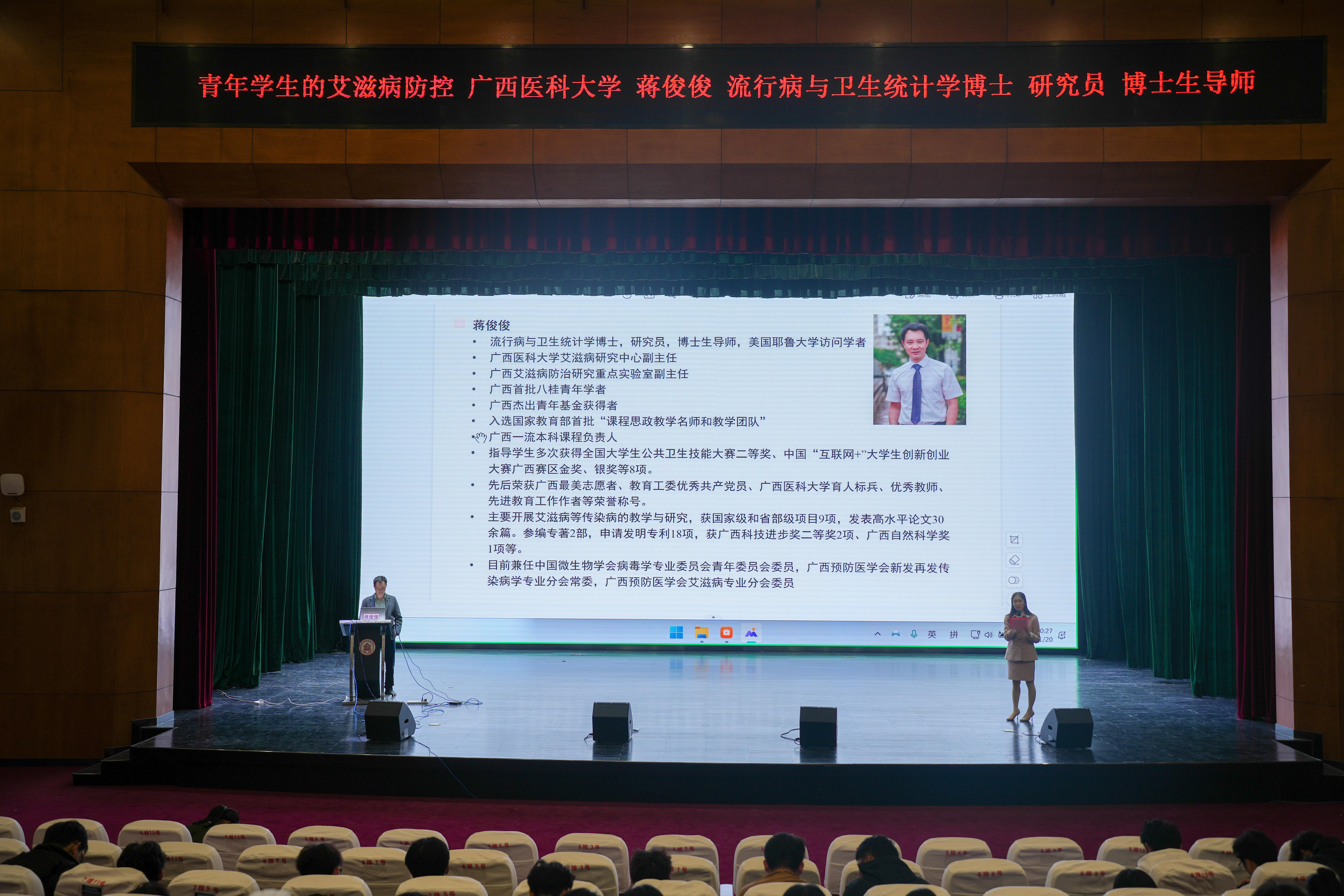 广西医科大学艾滋病研究中心副主任、博士生导师、研究员蒋俊俊博士以“凝聚社会力量,合力共抗艾滋”为主题,从什么是艾滋病、如何预防艾滋病角度,用一个个真实数据告诉师生员工:艾滋病离我们并不远。引导广大师生进一步树立正确的性观念,不断强化对性健康的正确认识,增强防治艾滋病的社会责任感。