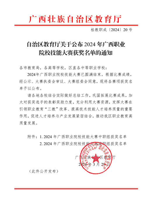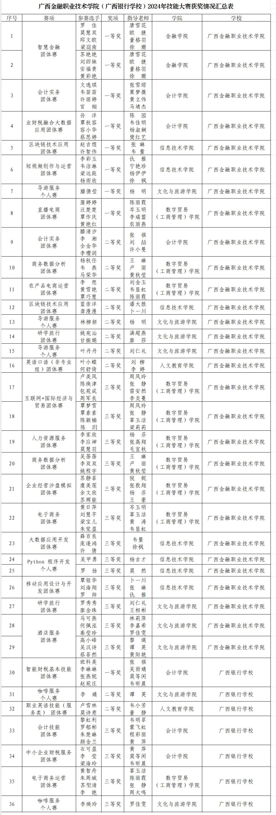 近日,由广西壮族自治区教育厅主办的2024年广西职业院校技能大赛圆满落幕。本次大赛学校共选派出131名选手参加34个赛项的角逐,根据自治区教育厅公布的获奖名单,kaiyun官网获奖数量共36项,获奖人数102人,获奖率达到77.86%,获奖总数创历史新高。其中,高职组一等奖8项,中职组一等奖1项;高职组二等奖8项,中职组二等奖3项;高职组三等奖13项,中职组三等奖3项,同比增长33.33%。区块链技术应用、业财税融合大数据应用、会计实务、短视频创作与运营、直播电商、导游服务、智能财税基本技能赛项各获赛项各获一等奖1项,智慧金融赛项获得一等奖2项。