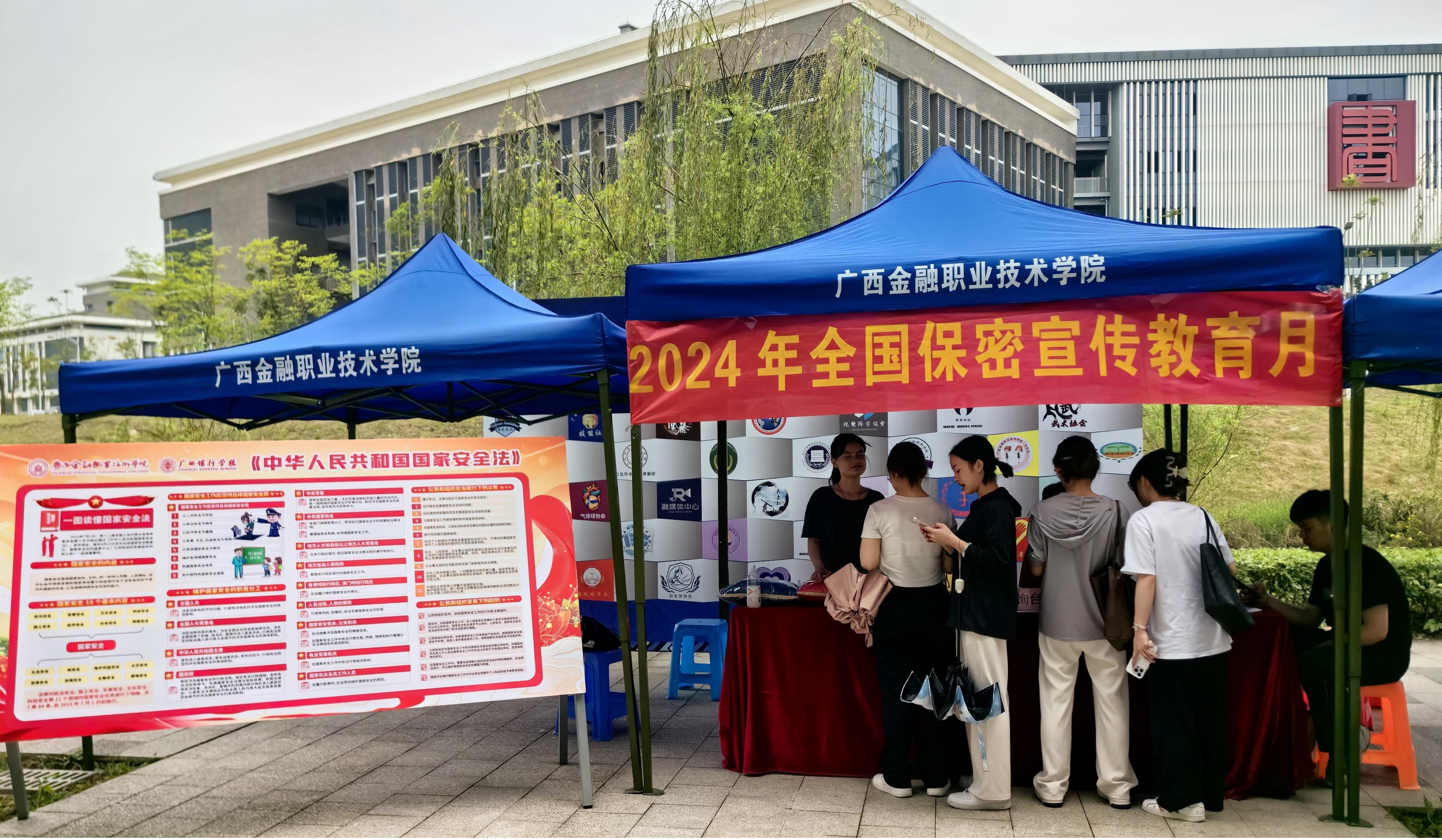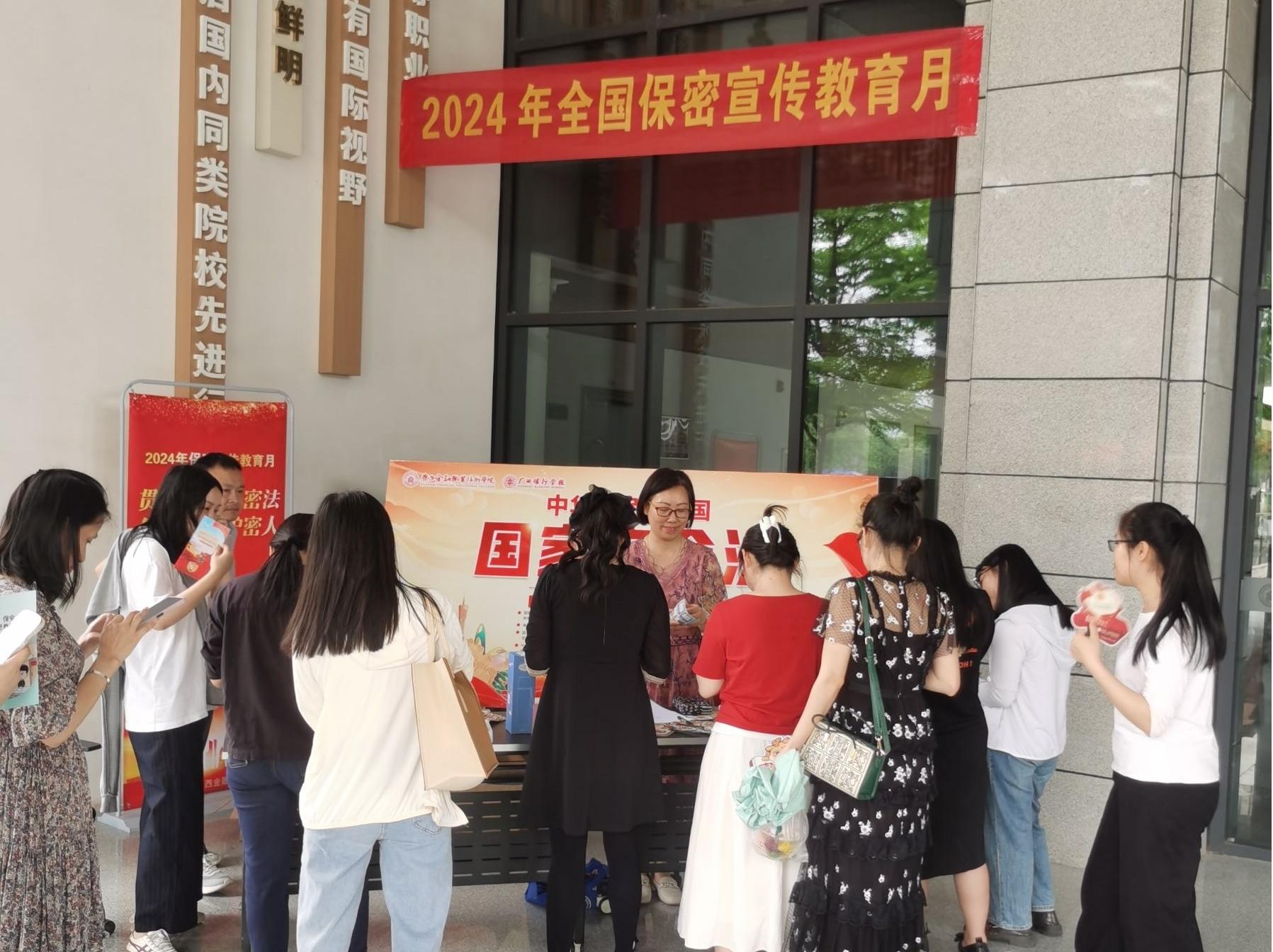 宣传教育月期间,学校通过设置咨询台、摆放宣传展板、悬挂宣传条幅,发放宣传折页、活动现场打卡转发朋友圈、观看广西保密宣传教育微电影《时空迷局》、拍摄保密宣传微视频《保守秘密,你我同行》、保密知识有奖竞答等,对保密法、保密工作责任等进行广泛宣传教育,进一步增强保密宣传教育的直观性、形象性和生动性,做到保密知识的全覆盖。