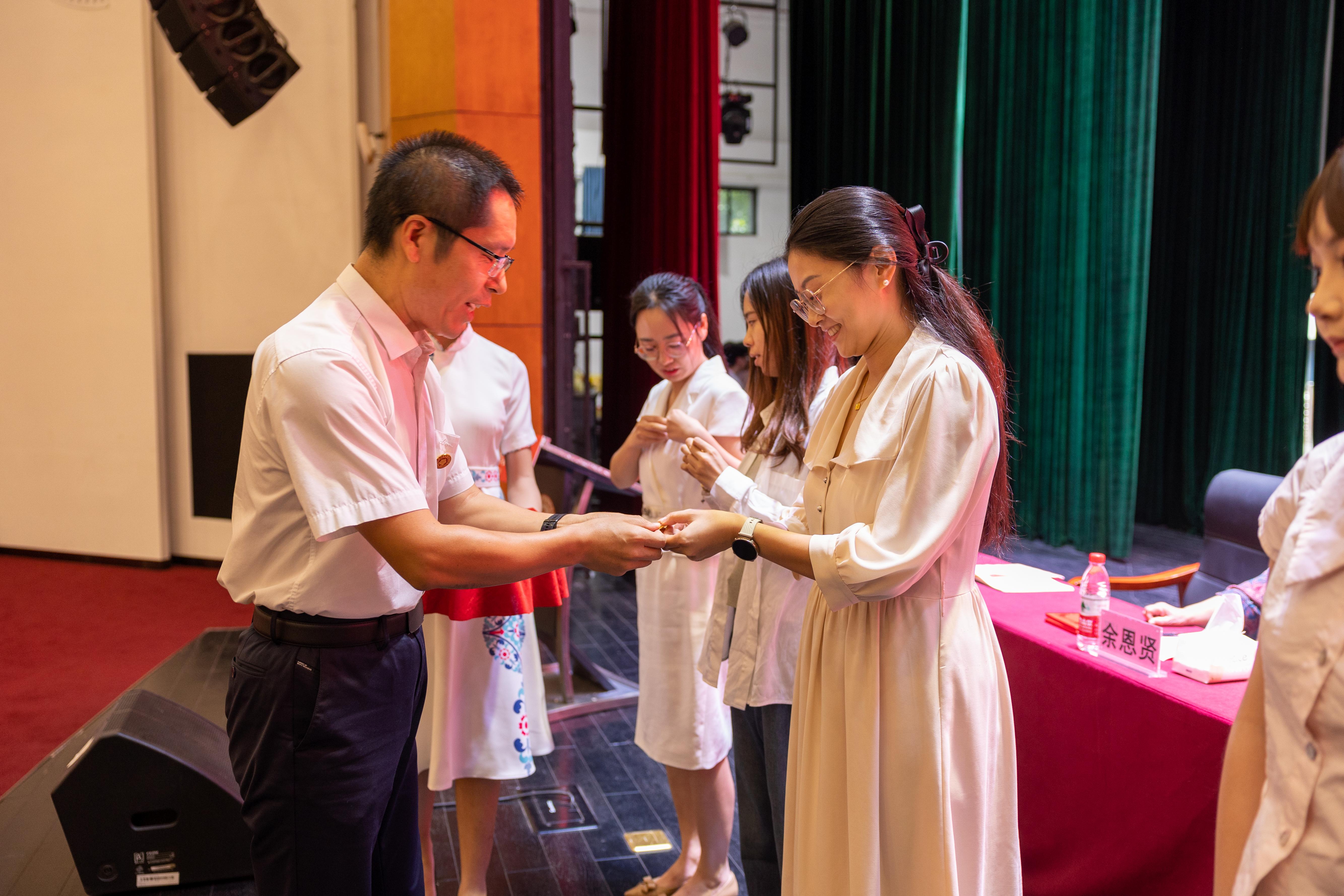 党委书记李高岩为新入职教师代表赠送学校徽章
