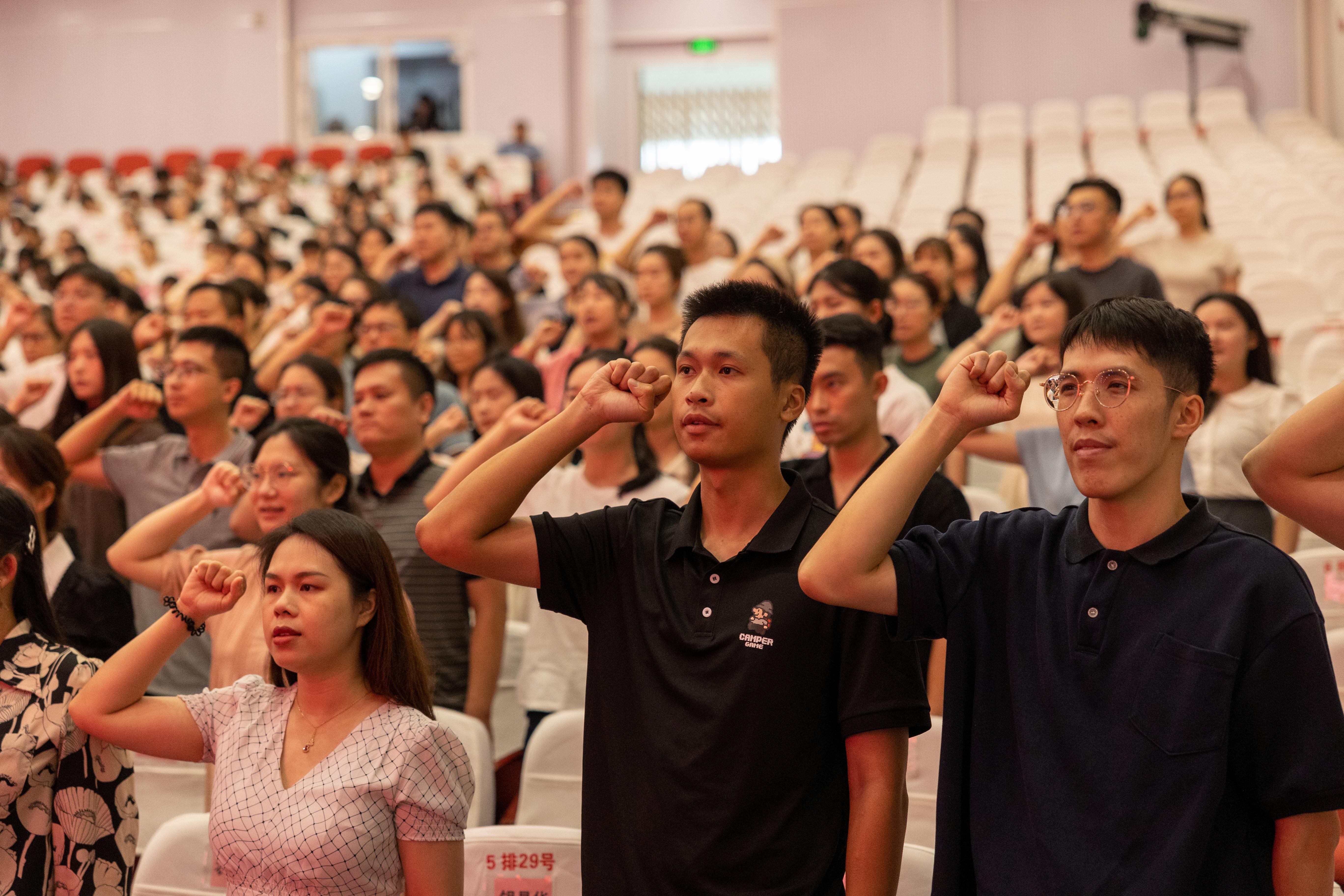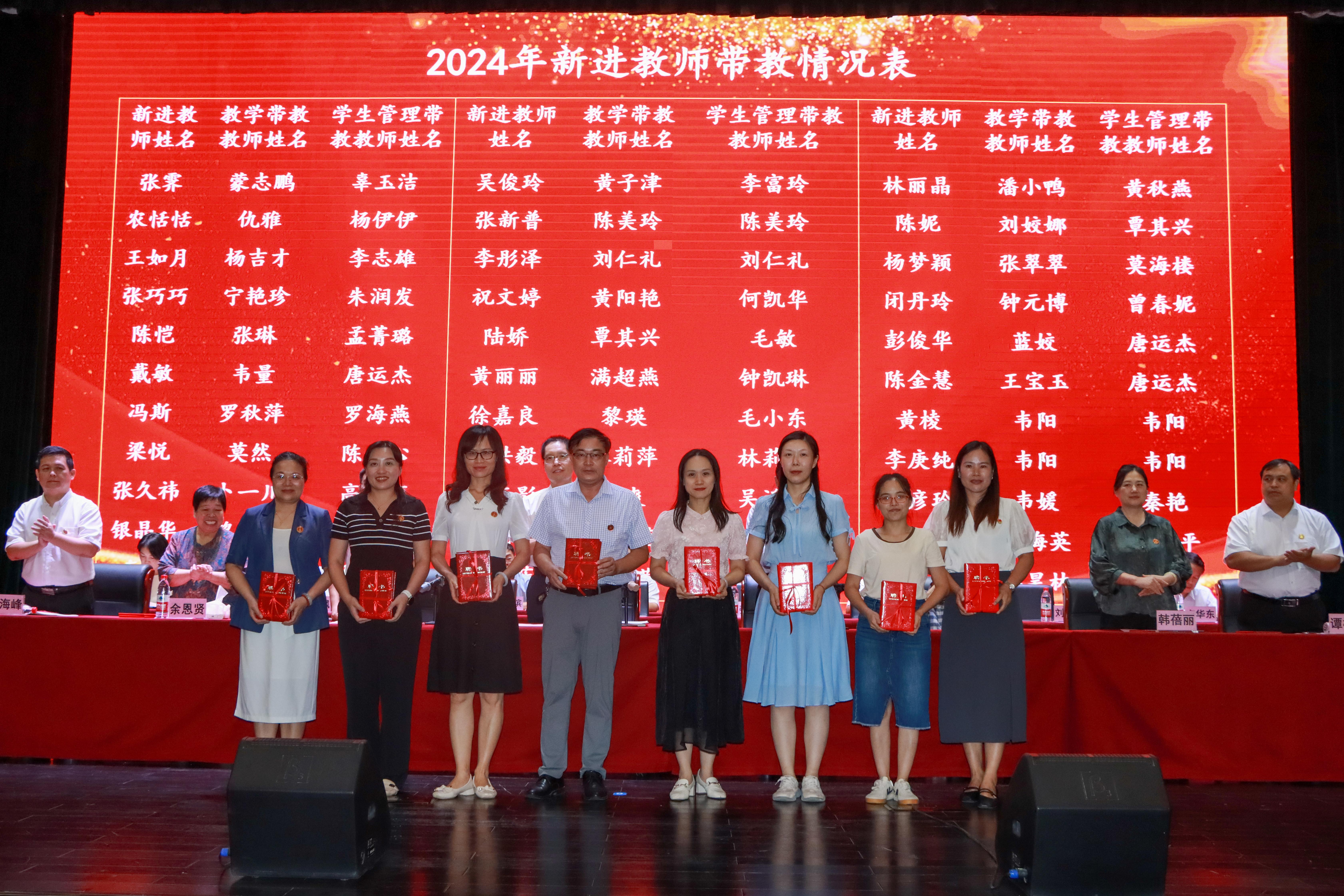李高岩书记为新入职教师代表及各二级学院及教辅部门代表赠送学校徽章。新入职教师在杨芬老师的带领下,高举右手,庄严宣读入职誓言,用坚定的声音表达了对教育事业的热爱和忠诚,为学生成长奉献的决心。