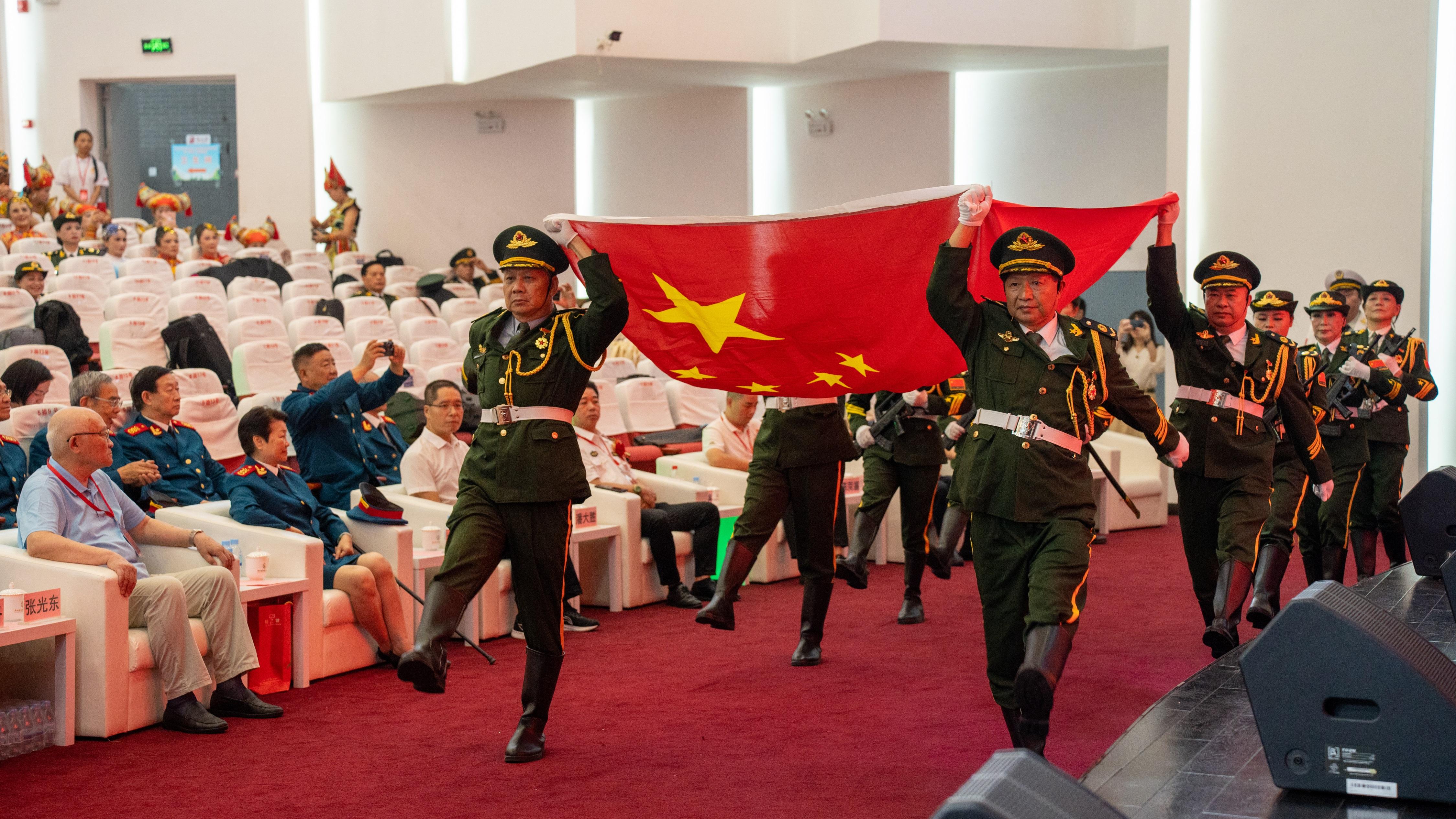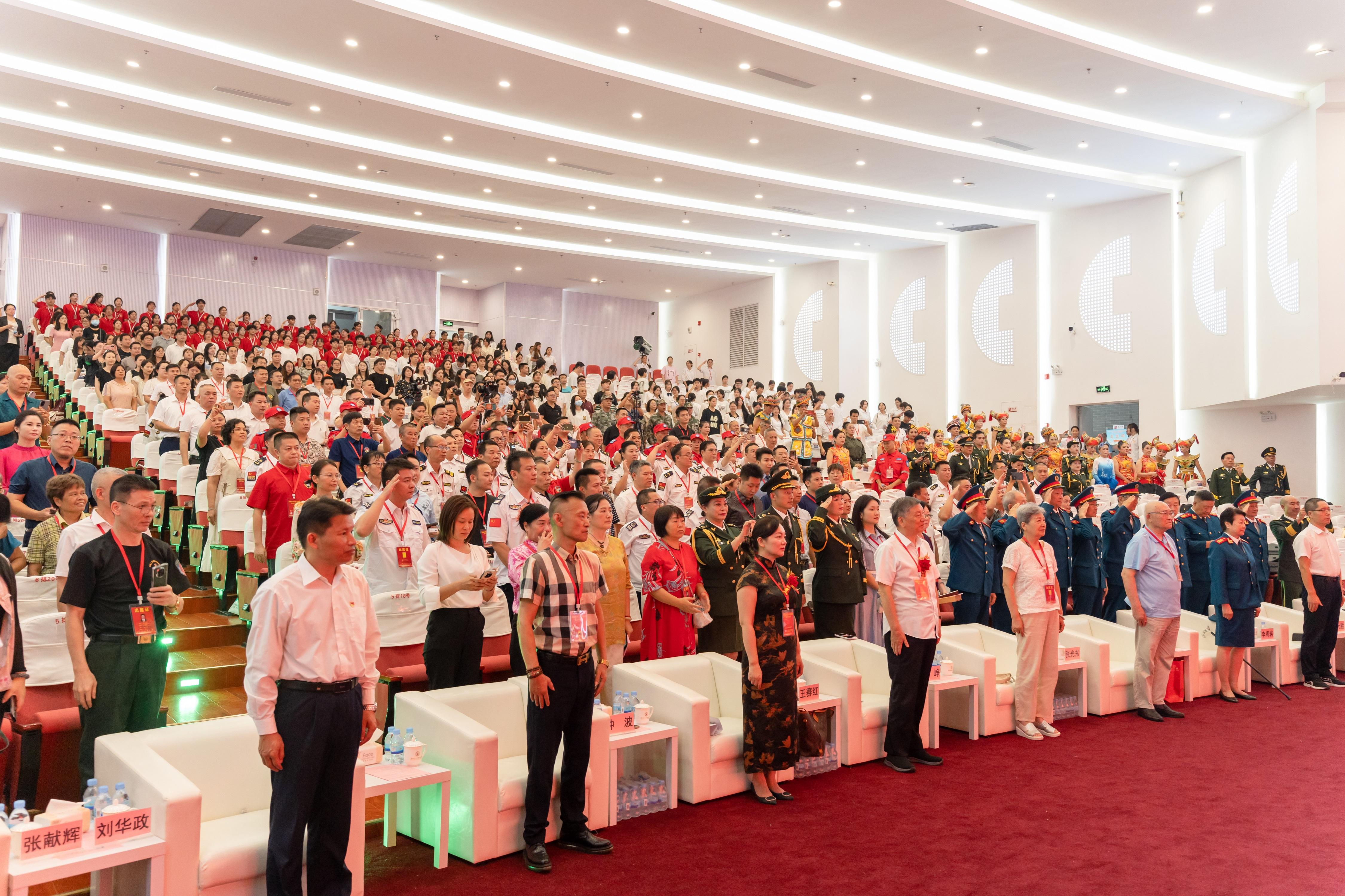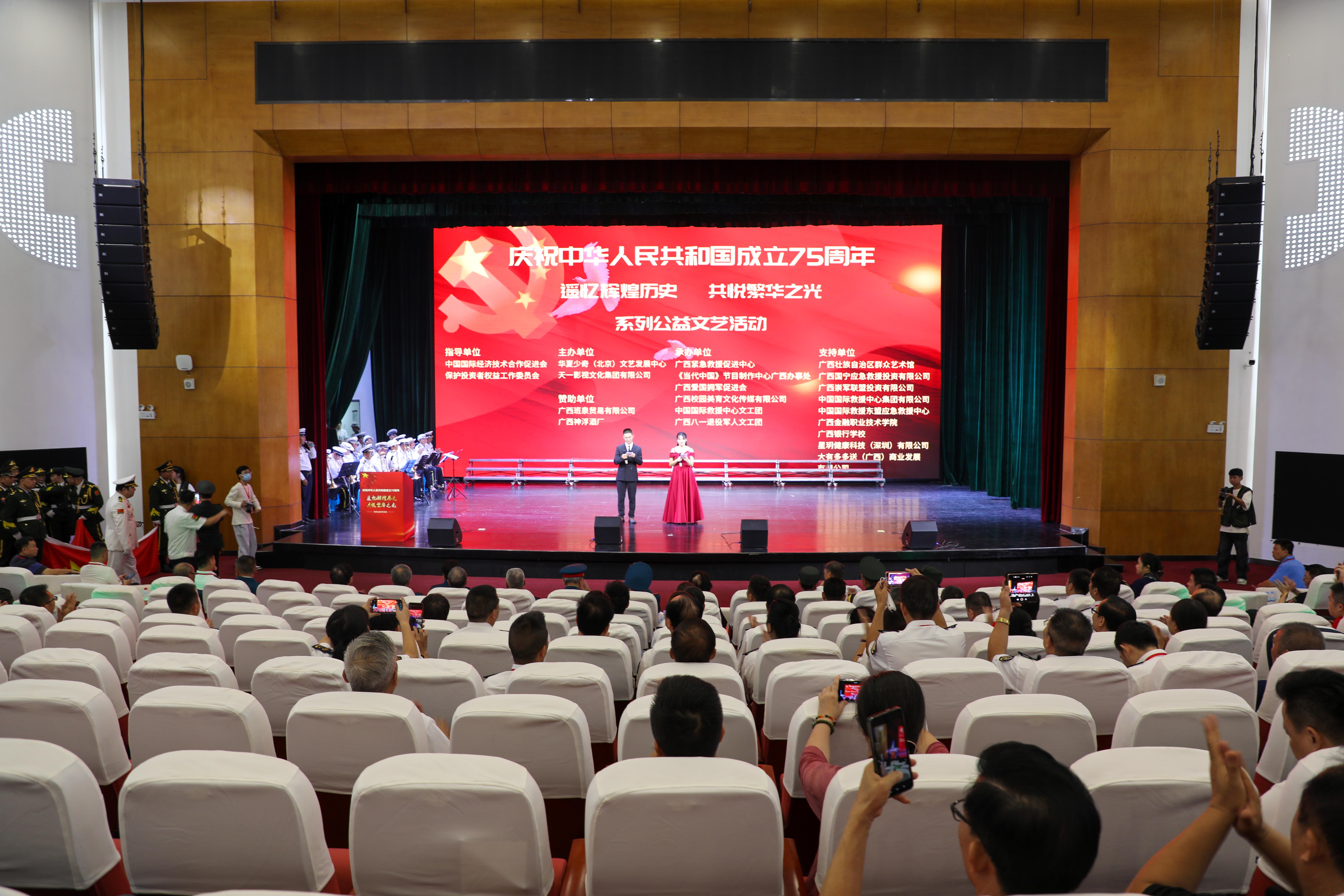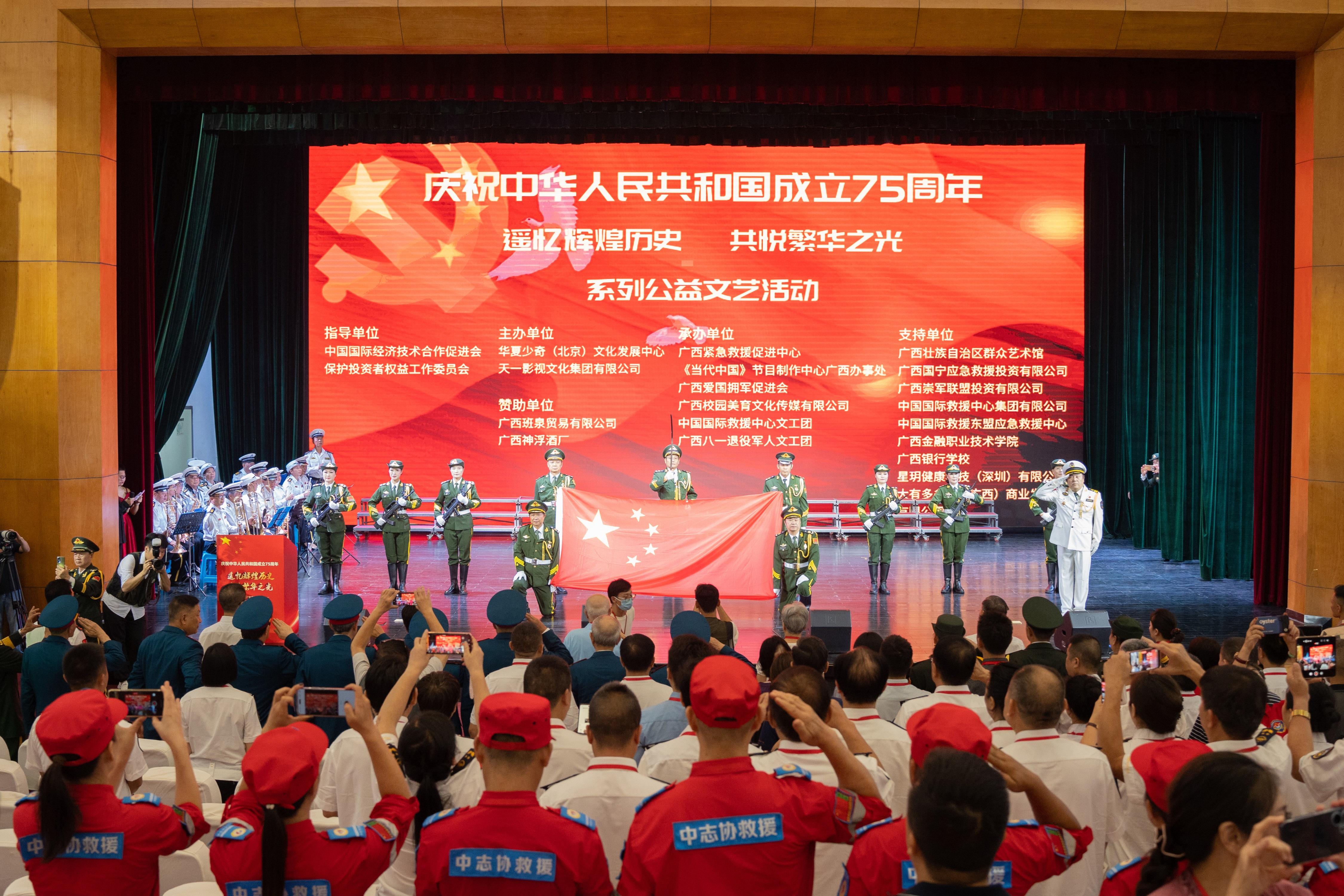 活动在庄严的国歌声中拉开帷幕。现场气氛庄严,由广西八一国旗护卫队护卫国旗进场,他们迈着整齐划一、坚定有力的步伐,护送着鲜艳的五星红旗走向舞台。