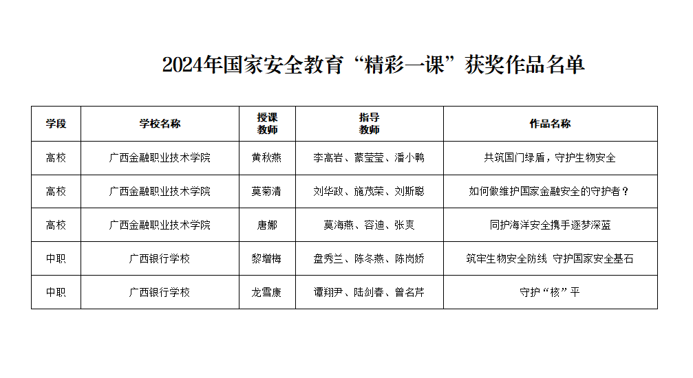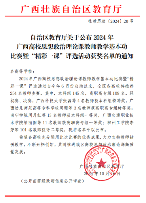 近日,根据广西壮族自治区教育厅公布的2024年全区国家安全教育“精彩一课”评选活动获奖名单、2024年广西高校思想政治理论课教师教学基本功比赛暨“精彩一课”评选活动获奖名单,kaiyun官网马克思主义学院参赛教师喜获佳绩,分别荣获一等奖一项、二等奖三项、三等奖两项。