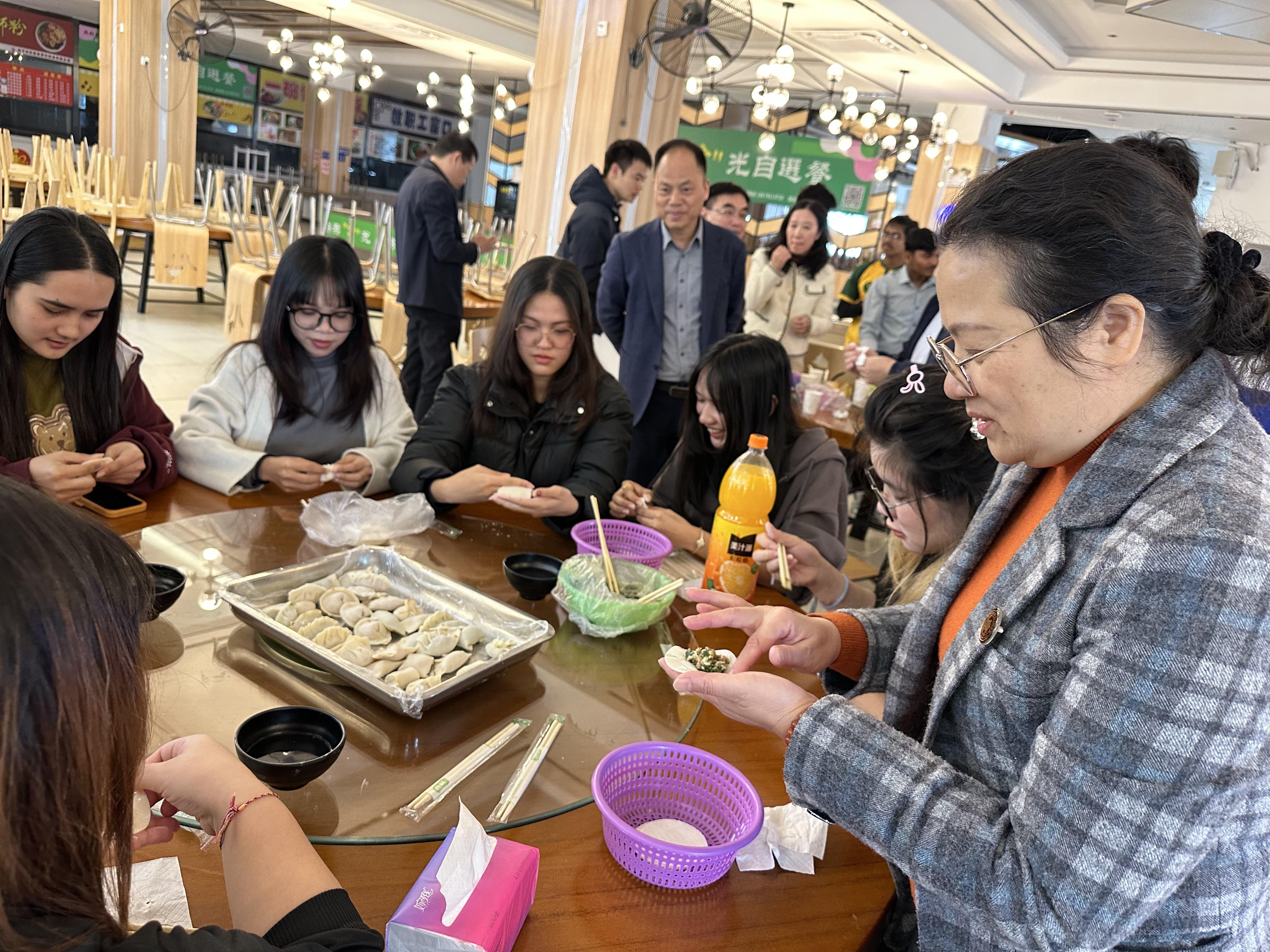 午餐时刻,热气腾腾的饺子摆上了餐桌,还有牛肉、鱼、鸡肉和汤圆等丰盛的中国传统菜肴和小吃,校领导们与国际学生们围坐一起,共进午餐。在就餐过程中,校领导亲切地询问了国际学生们的学习情况和生活习惯,并认真倾听了他们在中国的学习与生活感受及遇到的困难。整个现场充满了欢声笑语,气氛融洽。