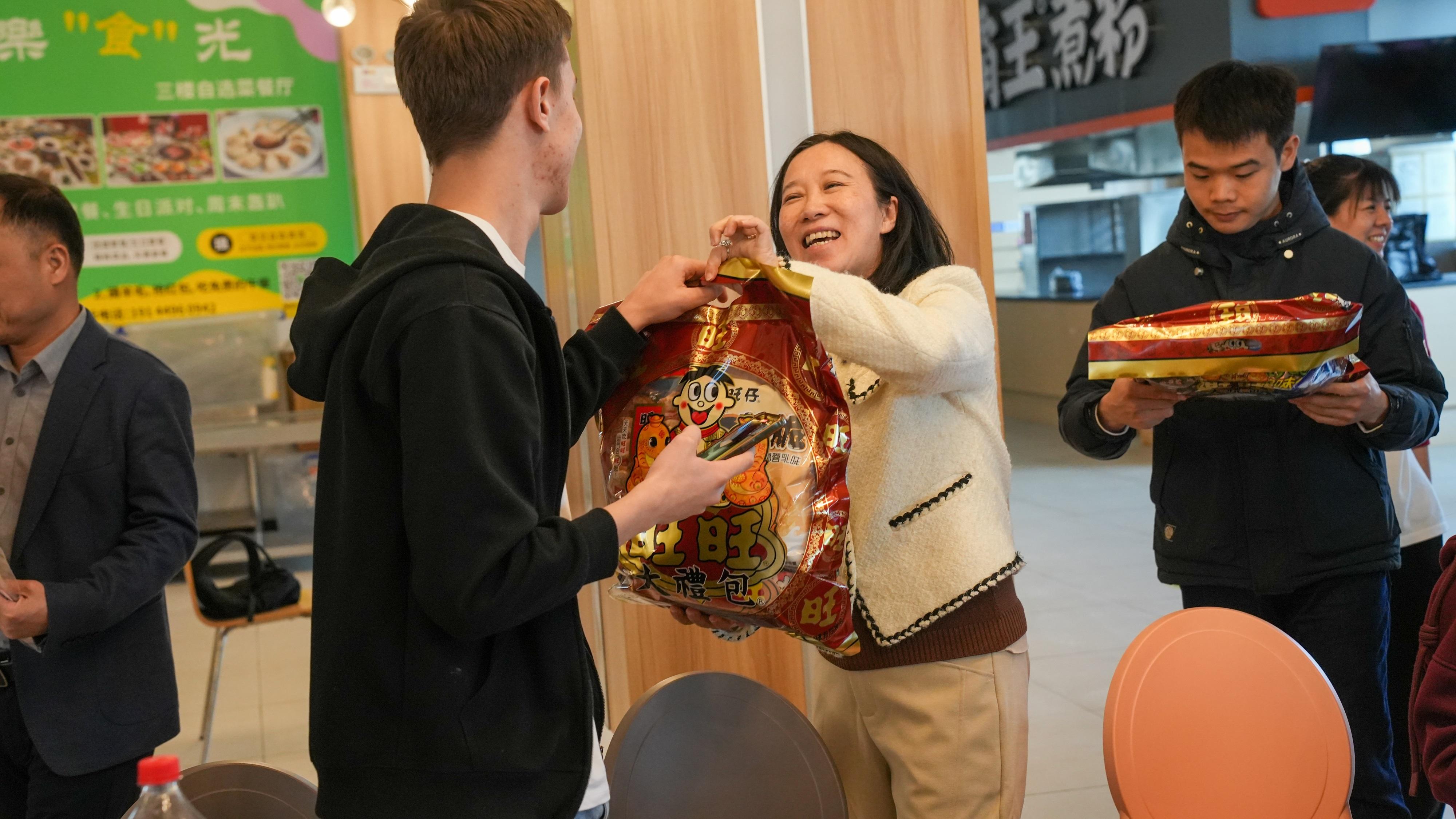 2025年新春佳节到来之际,“新春送福、饺香四溢——共贺中国年”的国际学生新春活动在学校西校区举行。学校党委书记李高岩,校长莫海燕,党委副书记、纪委书记刘华政,副校长谢沛善、潘大胜以及对外交流处、国际教育学院、金融学院和数字贸易学院的部门负责人和老师们与国际学生欢聚一堂,共度中国农历春节。