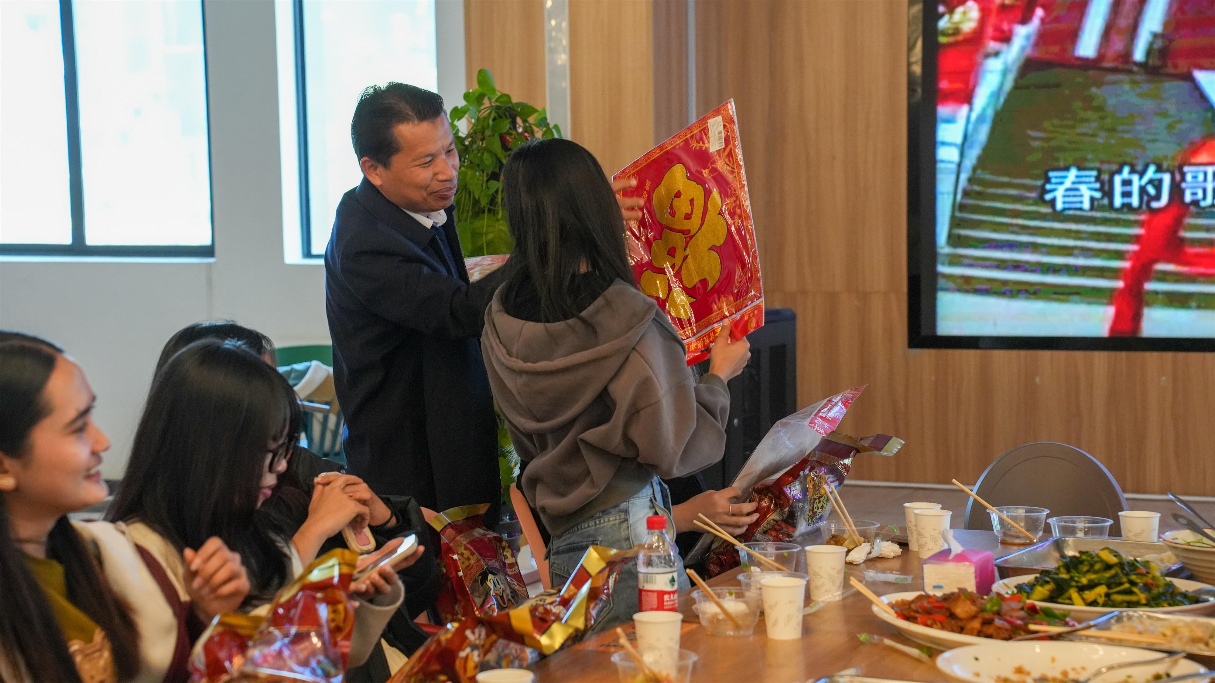 活动尾声,校领导为国际学生们赠送了“福”字和慰问品,寓意着新的一年福气满满、万事兴旺。国际学生们深受感动,纷纷表示感受到了来自学校的温暖与关怀。来自孟加拉国的金凡同学用不太流利的中文表达了自己的感激之情:“谢谢老师们为我们准备的活动,金职院让我感到像家一样温暖。”