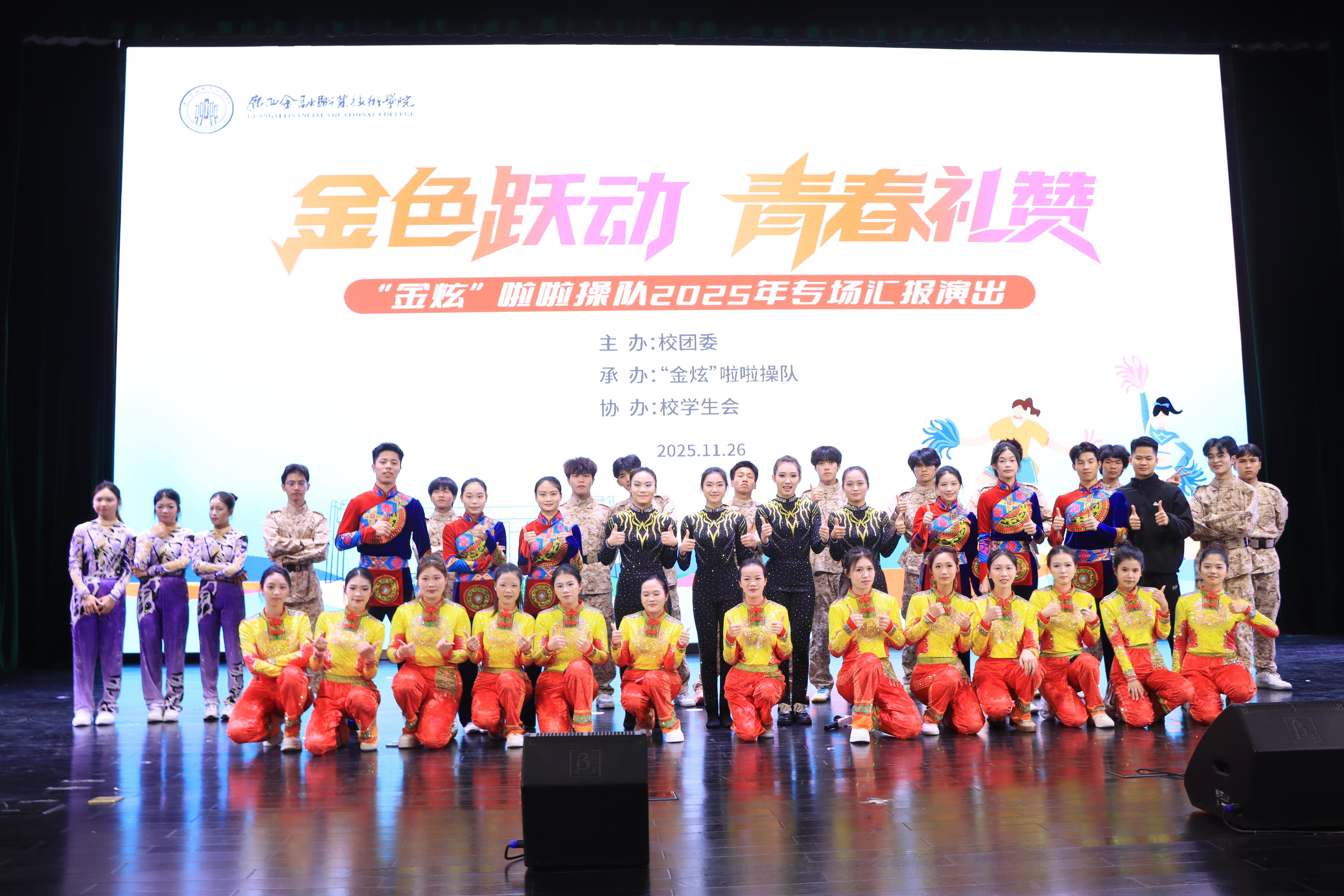 打造“金子”大众参与工程,构建“金”字品牌矩阵,厚植校园文化底蕴,推动第二课堂与第一课堂深度融合。“金韵” 合唱团斩获第二届 “陆海欢歌” 民歌合唱周金奖、基层文艺会演三等奖。“金炫”啦啦操队参加“壮美广西”2025年青少年健身操舞技能大赛荣获2个一等奖、广西壮族自治区第十四届学生运动会双人花球赛项勇夺高职高专组亚军。12月,开展2025 年 “金字” 文化品牌建设成果汇报演出(“金韵” 合唱团与 “金炫” 啦啦操队专场演出)。