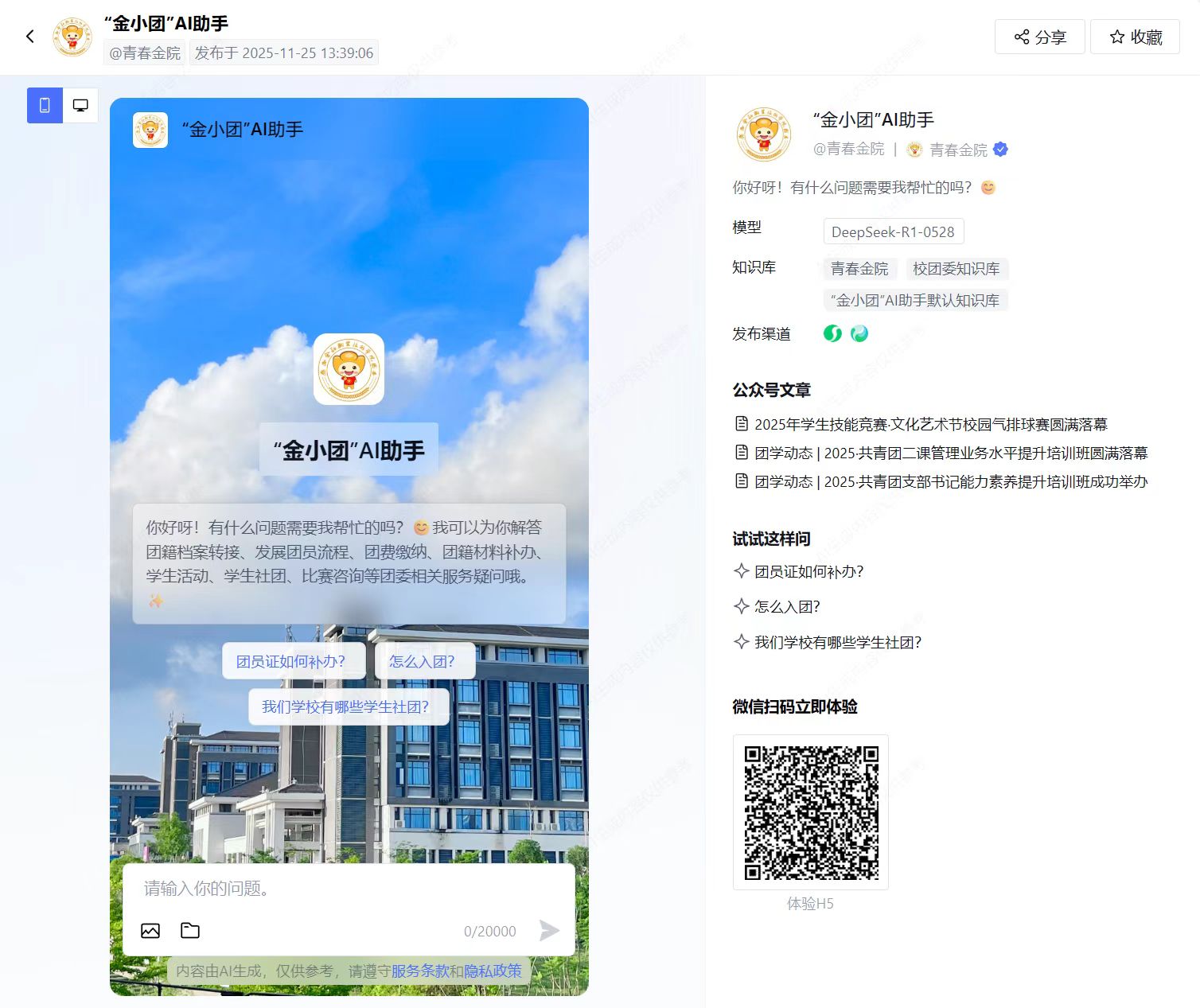 创新引入AI团务助手(测试版),深度整合智慧团建管理、第二课堂查询、创新创业咨询、就业岗位推送、团务办理指引等多元核心功能,全面覆盖团员青年团务办理、学习成长、就业创业等关键场景,构建“随时在线、精准对接、高效便捷”的校园数字化服务新生态。服务青年师生超1万人次,团务办理效率提升15%。