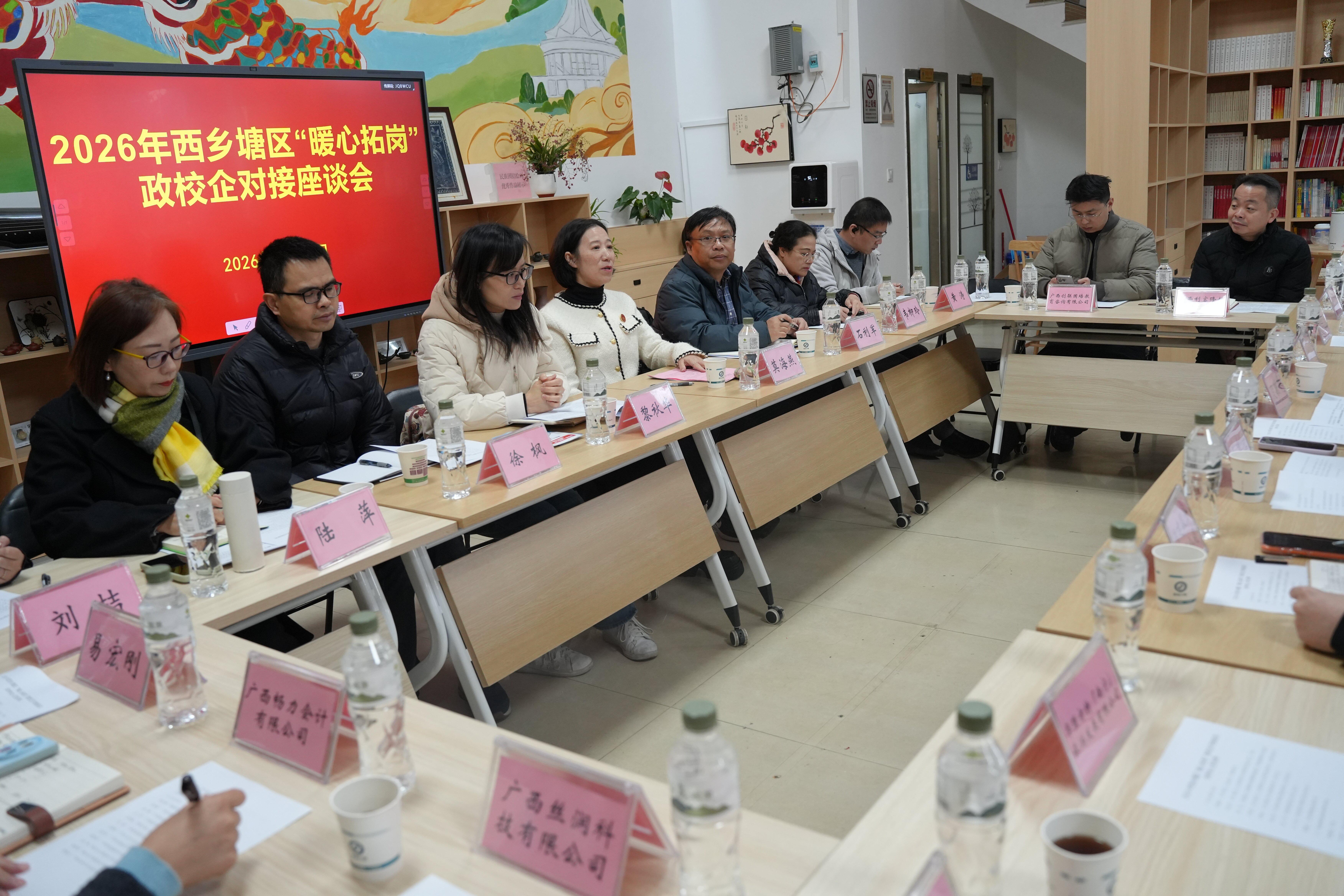 为深入贯彻落实高校毕业生就业工作相关部署,扎实开展2026届高校毕业生“寒假促就业暖心行动”,2026年1月22日上午,学校莫海燕校长率队到南宁市西乡塘区开展政校企合作的针对性毕业生就业推介。活动在南宁市大学路零工市场顺利举行。西乡塘区政府二级调研员段毓华出席活动。区委组织部、人社局、财政局、团委、西乡塘街道等单位分管领导,以及润建股份有限公司、广西筑星信息技术有限公司、华强方特(南宁)旅游发展有限公司等十多家重点企业代表共同参与了对接交流。学校招生就业处、各二级学院负责人及相关工作人员共同参与。