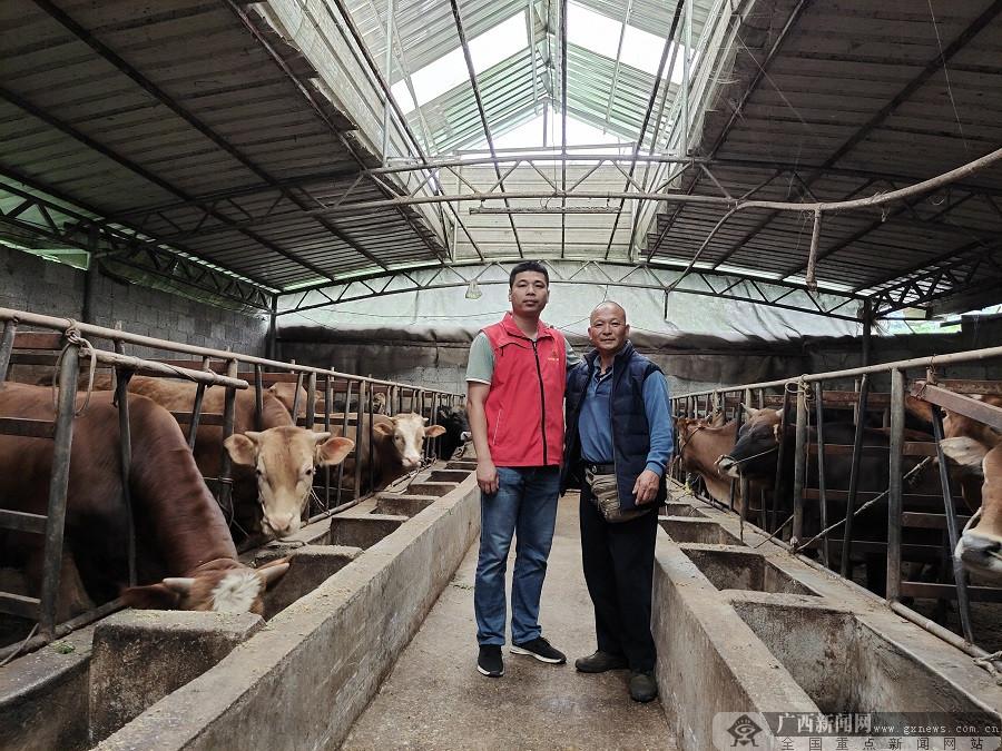 覃一君(左)指导致富能人发展养牛产业。蓝建胜 摄
