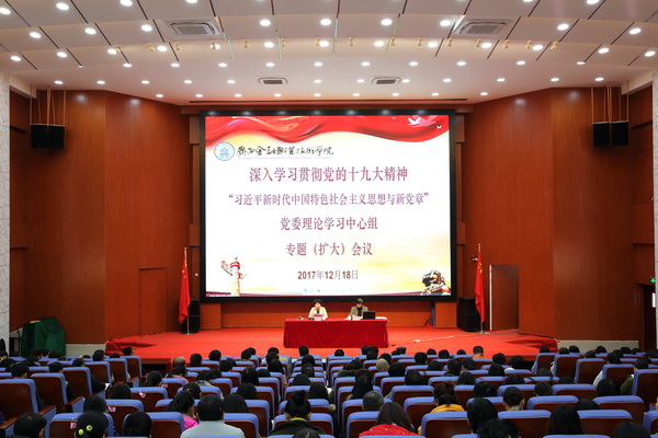 为继续深入学习党的十九大精神,加强思想政治工作建设,12月18日下午,学校特邀自治区党校教授、广西党校系统社科联副主席陈学璞教授为大家做题为《习近平新时代中国特色社会主义思想与新党章》专题讲座。讲座由党委书记沈立君主持。学院全体党员、科级以上干部、教师入党积极分子、学生入党积极分子共320人聆听讲座。