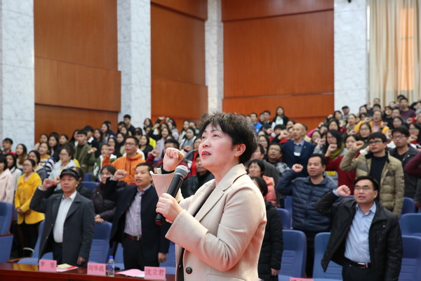 沈立君书记作总结讲话。她指出,陈教授的报告立位高远、内容丰富、讲解透彻,既有理论深度又有现实指导作用,对习近平新时代中国特色社会主义思想与新党章进行了精准阐述,是一堂内容丰富的思想政治教育课,让在座师生深受教育和启发。她要求,会后各单位要及时传达会议的主要内容和精神实质,通过组织专题学习会、研讨会、报告会等推动讲话精神入心入脑,使广大师生更加自觉地深入理解和掌握习近平新时代中国特色社会主义思想与新党章内容。一是要提高政治站位,充分认识学习宣传贯彻党的十九大精神的重要意义。二是要广泛宣传发动,大力营造学习宣传贯彻党的十九大精神的浓厚氛围。三是要立足学校实际,推动党的十九大精神在学校落地见效。