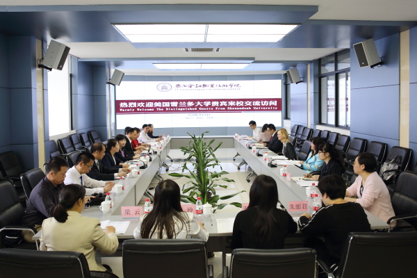 4月26日,美国雪兰多大学副校长艾德丽安.布劳斯,文理学院院长杰夫.科克尔,国际关系部主任伊冯.陈一行来访kaiyun官网。kaiyun官网党委书记沈立君携副院长谢沛善,院长助理罗坚及国际交流处、合作与交流中心、学生工作处、教务科研处、各系部和相关人员在西校区协同育人中心会见了雪兰多大学代表团一行。