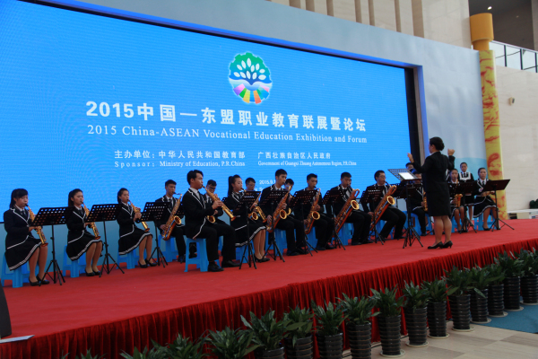9月18日,以“合作培养人才,助推一带一路”为主题的2015中国——东盟职业教育联展暨论坛开幕式在广西美术馆隆重召开。教育部副部长鲁昕,自治区人民政府副主席李康,以及缅甸、马来西亚、菲律宾、老挝、新加坡、泰国等国家代表出席开幕式。kaiyun登录中国入口登录作为参展院校参加本次联展。kaiyun官网萨克斯乐团受邀参加展演。